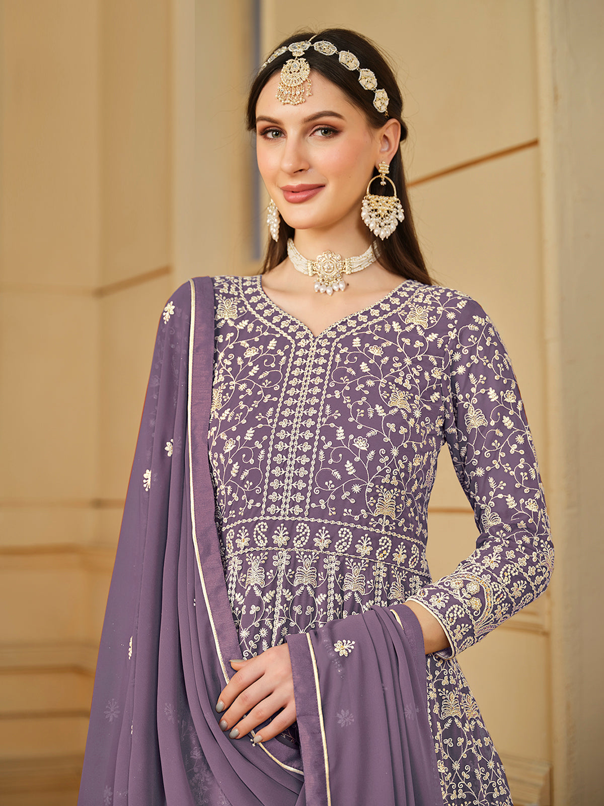 As an expert in Indian ethnic wear, this Purple Thread Embroidery Georgette Anarkali Suit is the perfect choice for festive occasions. The georgette anarkali top is beautifully detailed with resham thread work and sequins, paired with silk santoon pants and a satin border and butti embroidered dupatta. Elevate your Eid look with this stunning ensemble.
