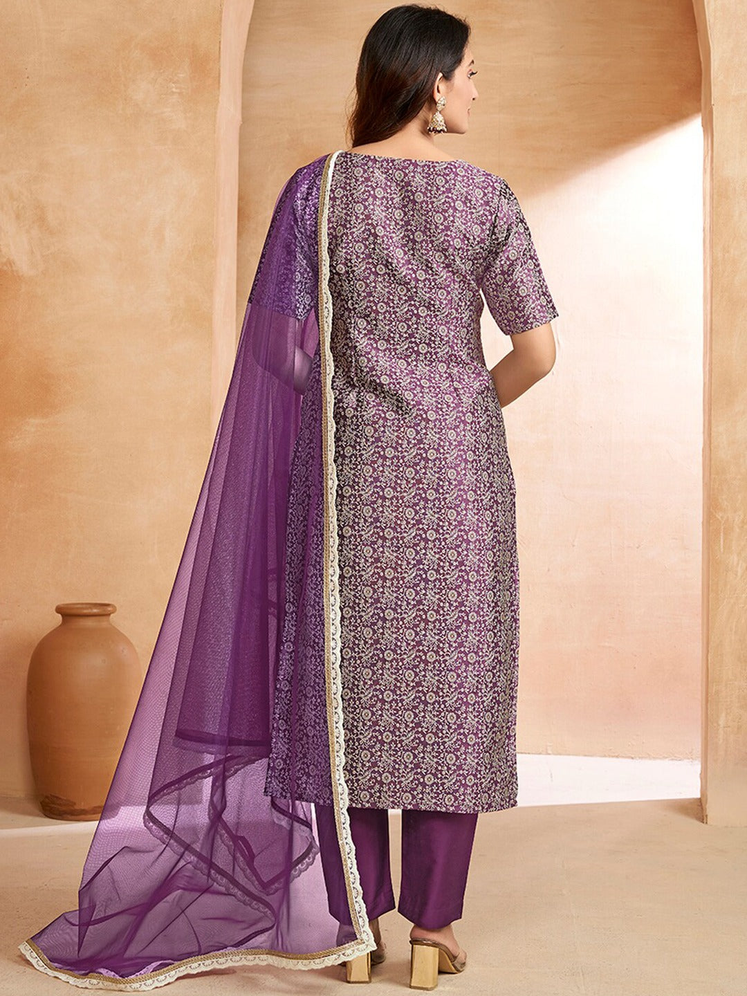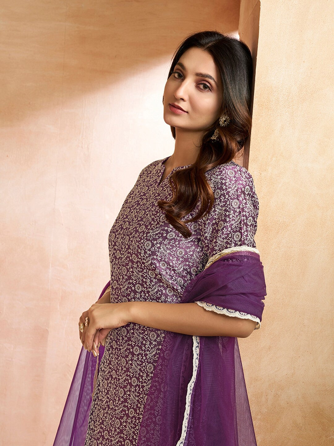 This purple floral printed kurta with trousers and dupatta is crafted in a straight shape design from silk blend fabric. It features a round neck, short regular sleeves, and thread work detailing. The calf-length kurta has a straight hem and is paired with solid trousers that have a partially elasticated waistband for a comfortable fit. Perfect for any casual occasion.
