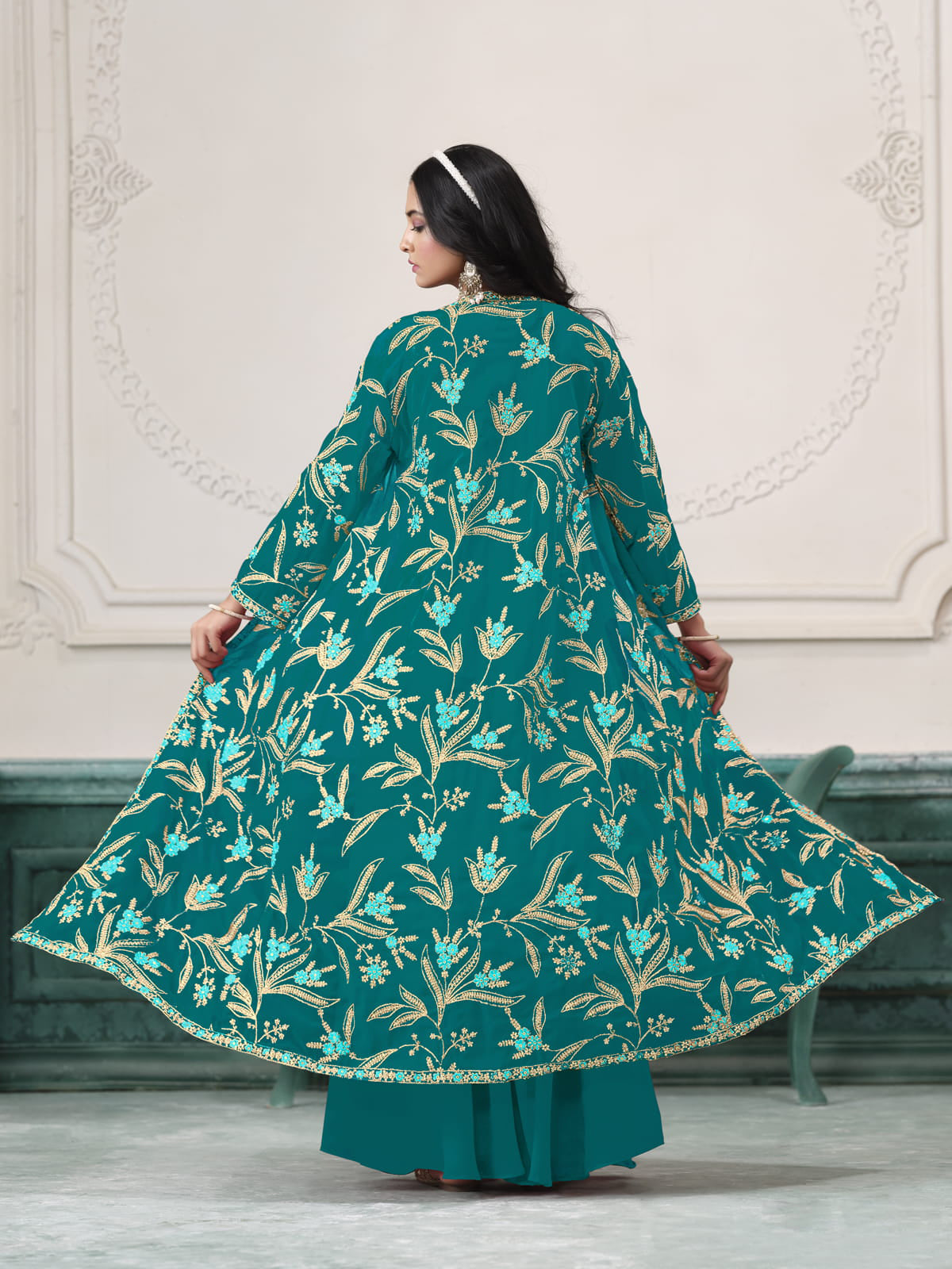 This Rama Embroidered Jacket Style Sharara Suit exemplifies artisanal excellence with its exquisite zari thread embroidery and sparkling sequin work. The luxurious faux georgette fabric adds effortless elegance and the beautifully embroidered jacket elevates the look with a modern twist. Perfect for festive celebrations and parties, this creation blends traditional artistry with contemporary style.