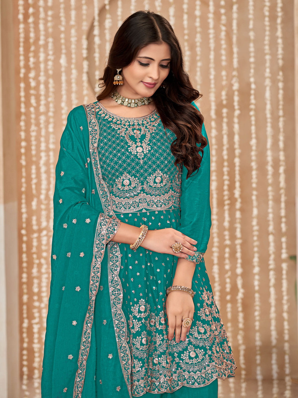 Elevate your festive and wedding style with Inddus Rama Green Embroidered Suit. Made with luxurious chinnon material and adorned with zari thread and sequins work, this suit exudes elegance. Complete the look with matching bottom, dupatta, and traditional jewelry for a statement ensemble. Best for festivals and weddings, this versatile palazzo salwar suit will make you stand out in any traditional event.