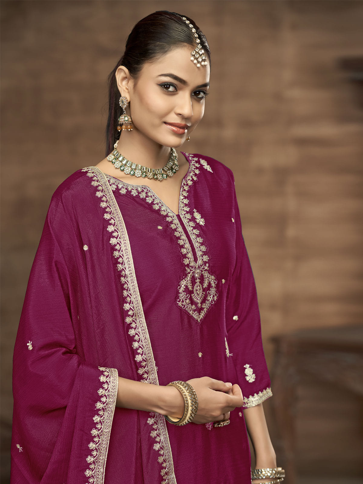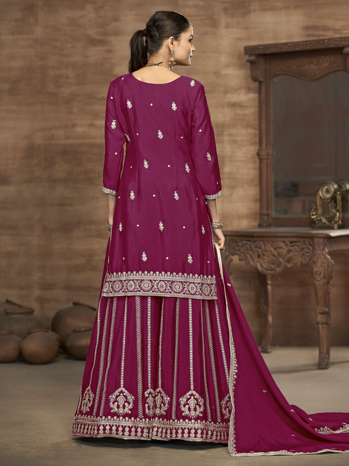 This Rani Chinon and silk sharara set combines understated elegance with exquisite craftsmanship. Featuring intricate embroidery enhanced by sequins and zari work, it offers a refined yet captivating look. The ensemble includes a matching dupatta, completing the sophisticated appeal ideal for special occasions.