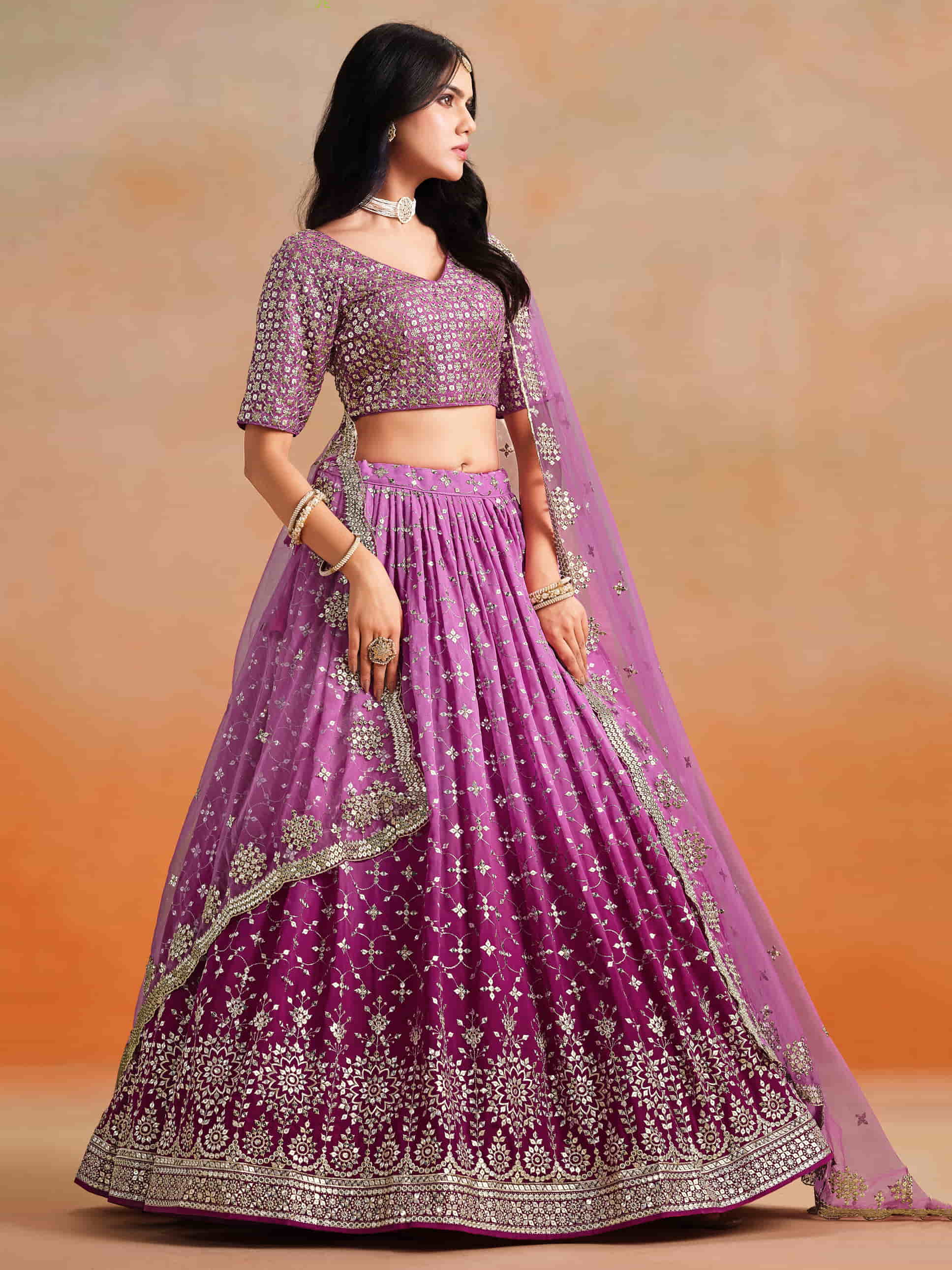 The pink two-tone georgette lehenga features rich zari embroidery and sequins work with decorative latkans.