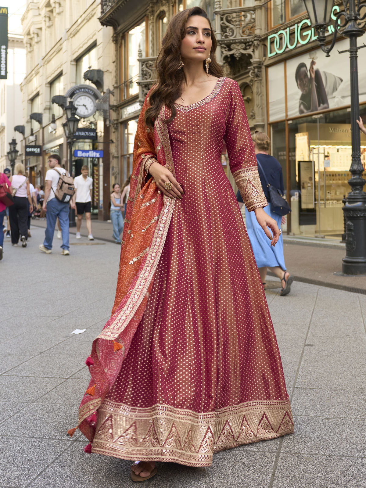 Embrace timeless elegance with this Red and Orange Traditional Embroidery Anarkali Suit, a masterpiece of Indian craftsmanship. The flared viscose jacquard silk anarkali kurta showcases intricate embroidery embellished with golden zari, resham thread, beads, and sequins that elevate its graceful silhouette. Paired with comfortable santoon pants and coordinating lining, this ensemble ensures both style and wearability. The chinnon silk dupatta features a striking digital bandhani print complemented by delicate embroidery and tassel detailing for a refined ethnic aesthetic. Perfect for weddings and festive occasions, style with gold jewelry and a statement clutch. Enjoy free international shipping on this exquisite piece.