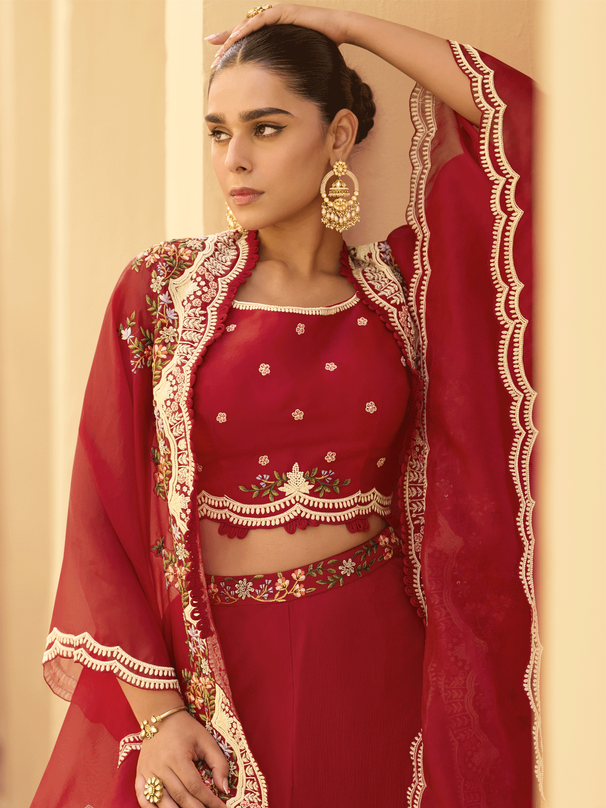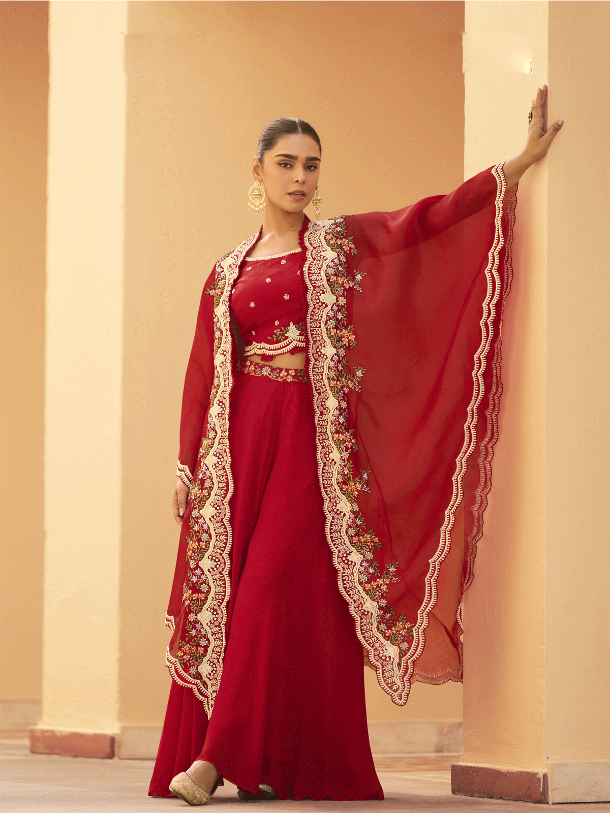 This striking red chinon indowestern ensemble captures festive elegance through meticulous craftsmanship. Hand-embroidered with intricate threadwork, shimmering beads, and sequins, each piece showcases artisanal detail. The blouse features a gracefully rounded neckline that softens into a subtle U-shape, offering a flattering silhouette enhanced by the sleeveless cut for contemporary sophistication. The matching embroidered cape drapes with understated volume, adding dimension and handcrafted richness to complete the set. Perfect for weddings and celebrations, this palazzo suit merges traditional embellishment with modern styling.