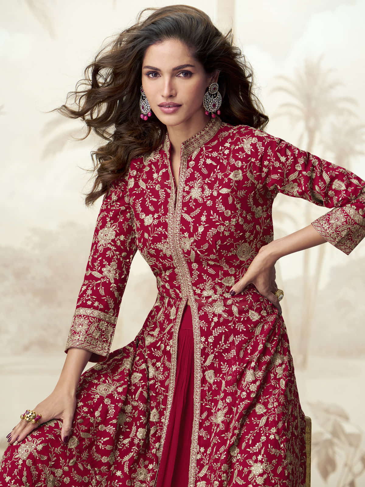 This Red Embroidered Slit Georgette Skirt Style Anarkali Suit combines traditional elegance with contemporary design. Crafted from lightweight georgette fabric, it features intricate embroidery that enhances its rich red hue. The slit skirt style adds a modern touch while ensuring ease of movement. Perfect for festive occasions, this Anarkali suit offers both comfort and sophistication, making it a refined choice for your ethnic wardrobe.