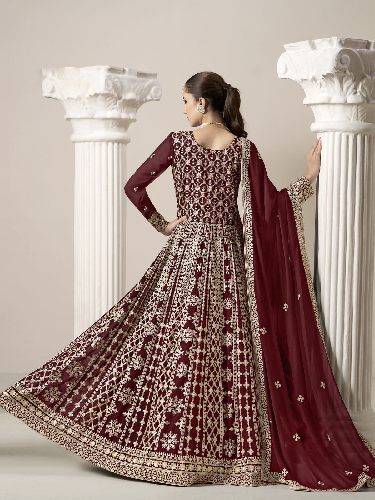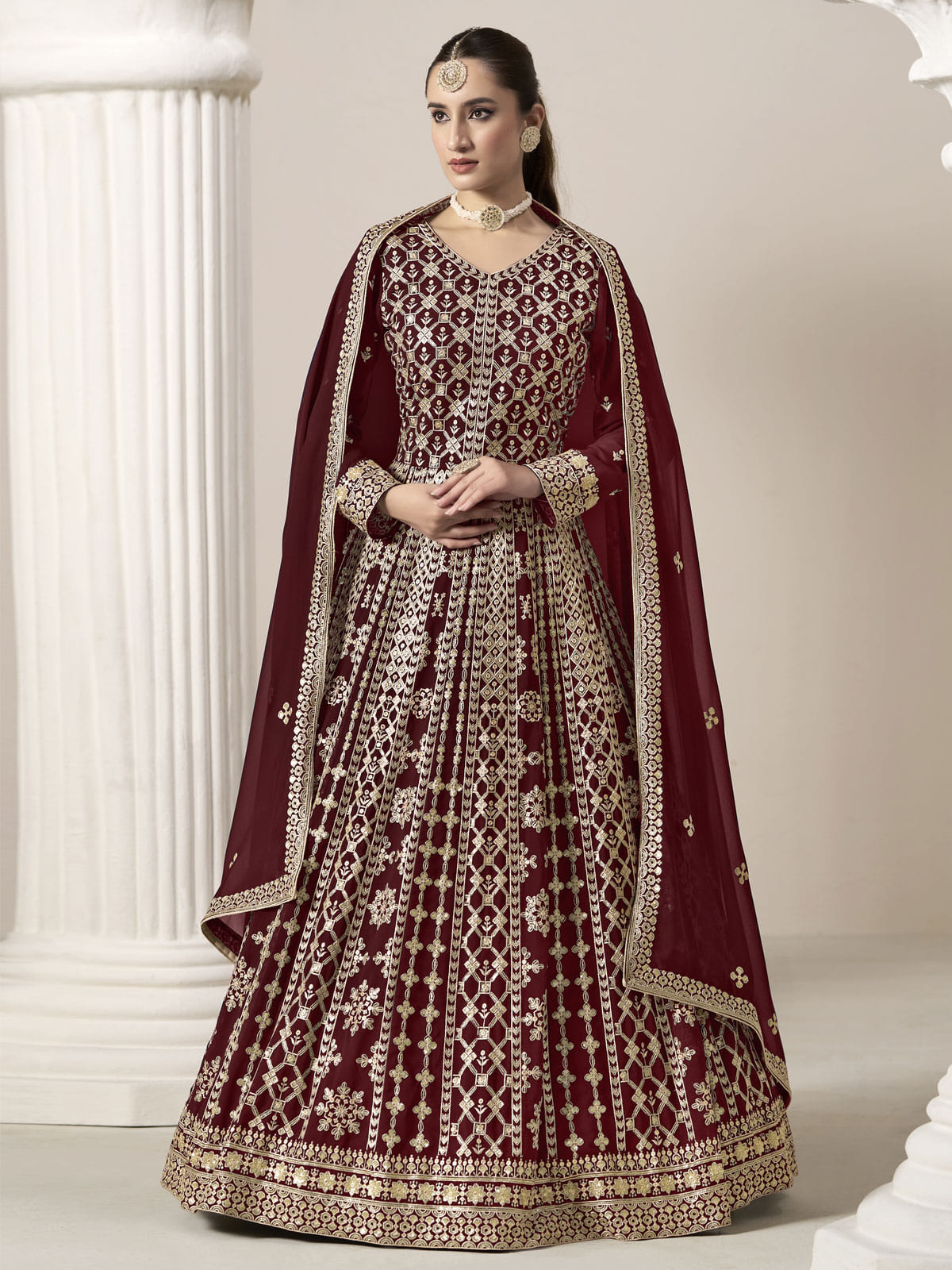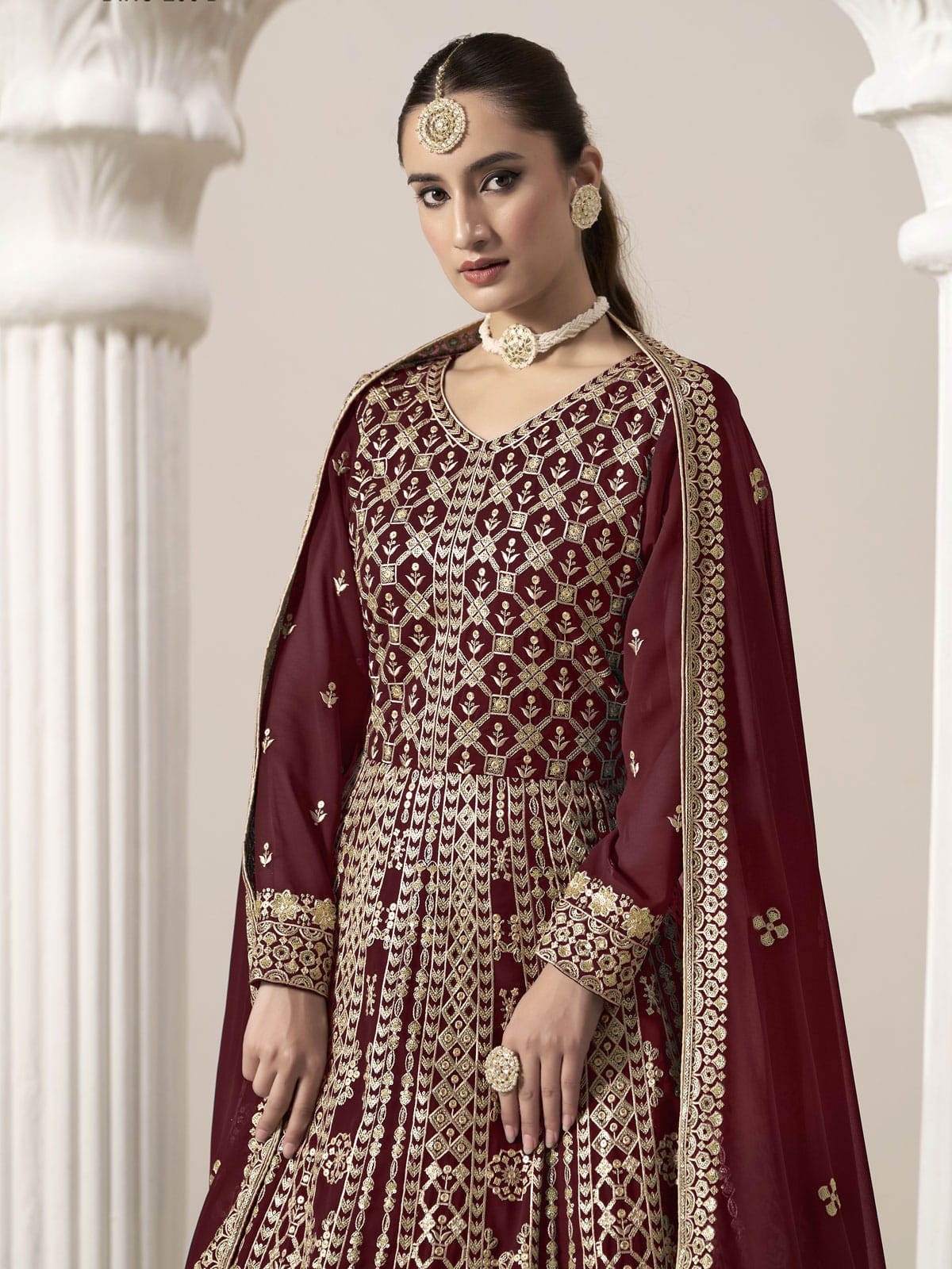 Expertly crafted for the festive season, the Deep Red Embroidery Georgette Anarkali Suit showcases intricate reshamkari embroidery with zari and sequence work. Made with high-quality georgette and paired with silk santoon pants and lining, this outfit exudes elegance. The butti-embroidered georgette dupatta adds a touch of charm. Make a statement with this stunning ensemble and complete the look with golden jewelry and stilettos.