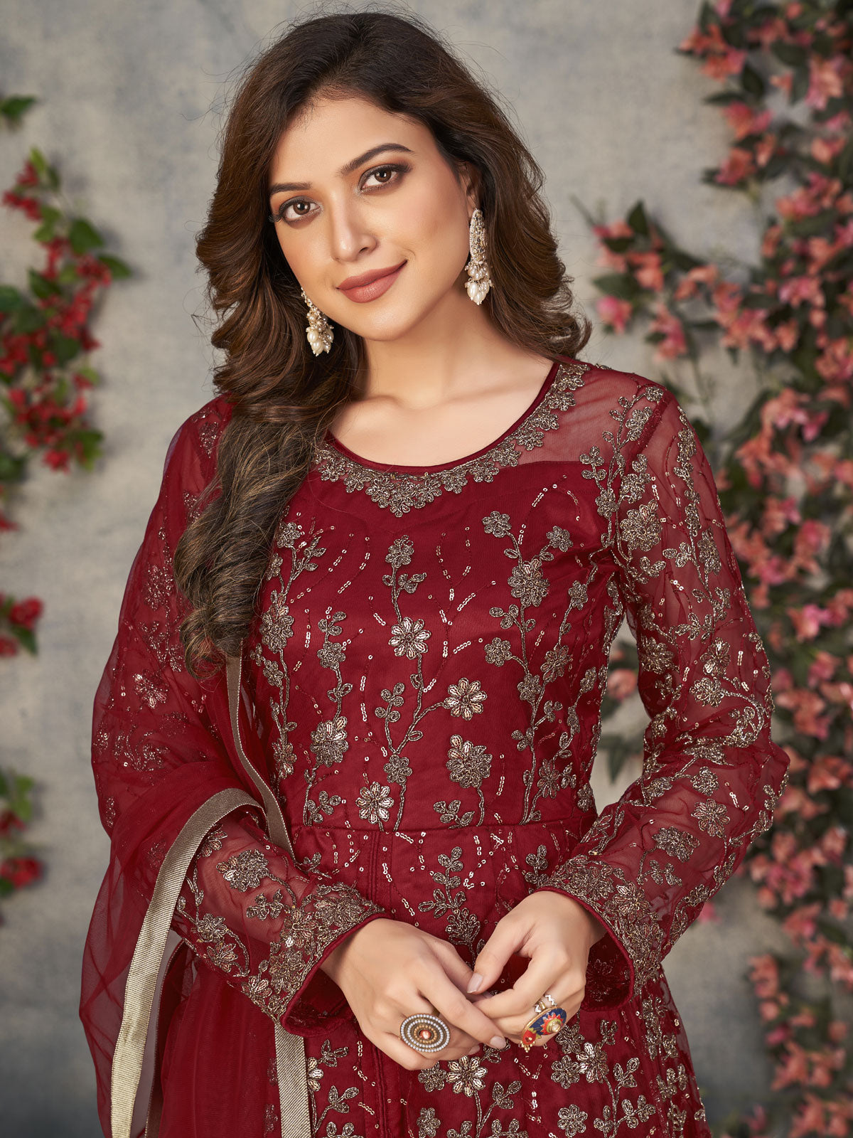 Make a striking impression at your next celebration in this exquisite red net Anarkali suit. Expertly crafted for festive wear, this A-line silhouette features a dramatic high slit that adds contemporary flair to traditional design. The luxurious net fabric is adorned with intricate embroidery work, complemented by luminous sequins and refined coding that catch the light beautifully. Every detail has been thoughtfully executed to deliver sophisticated elegance and timeless charm, ensuring you stand out with grace and confidence at any special occasion.