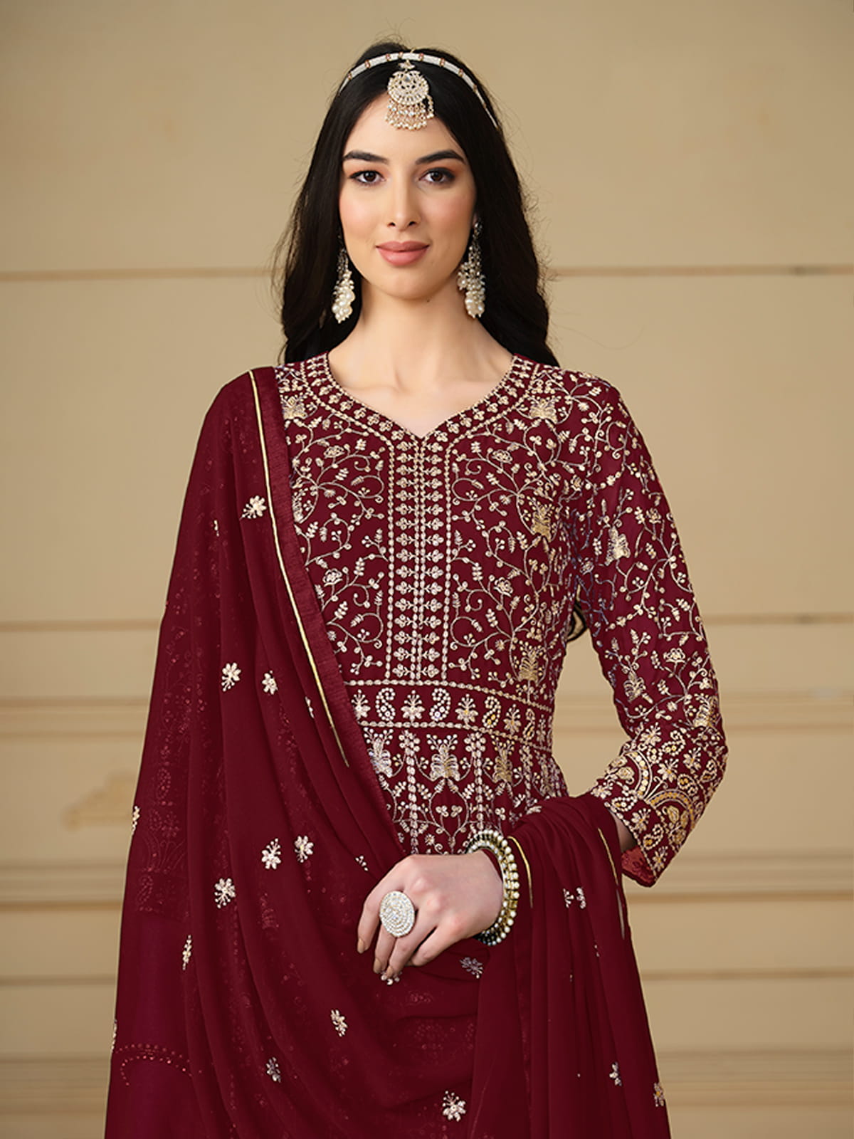 Get ready for the wedding season with our Bridal Red Sequence Embroidery Georgette Anarkali Suit. The finely detailed reshamkari zari embroidery and sequence work on georgette add a touch of elegance to this ethnic wear. Paired with silk santoon pants and a beautifully embroidered georgette dupatta, this suit is perfect for Eid celebrations. Complete the look with some golden jewelry and stilettos for a truly stunning diva look.