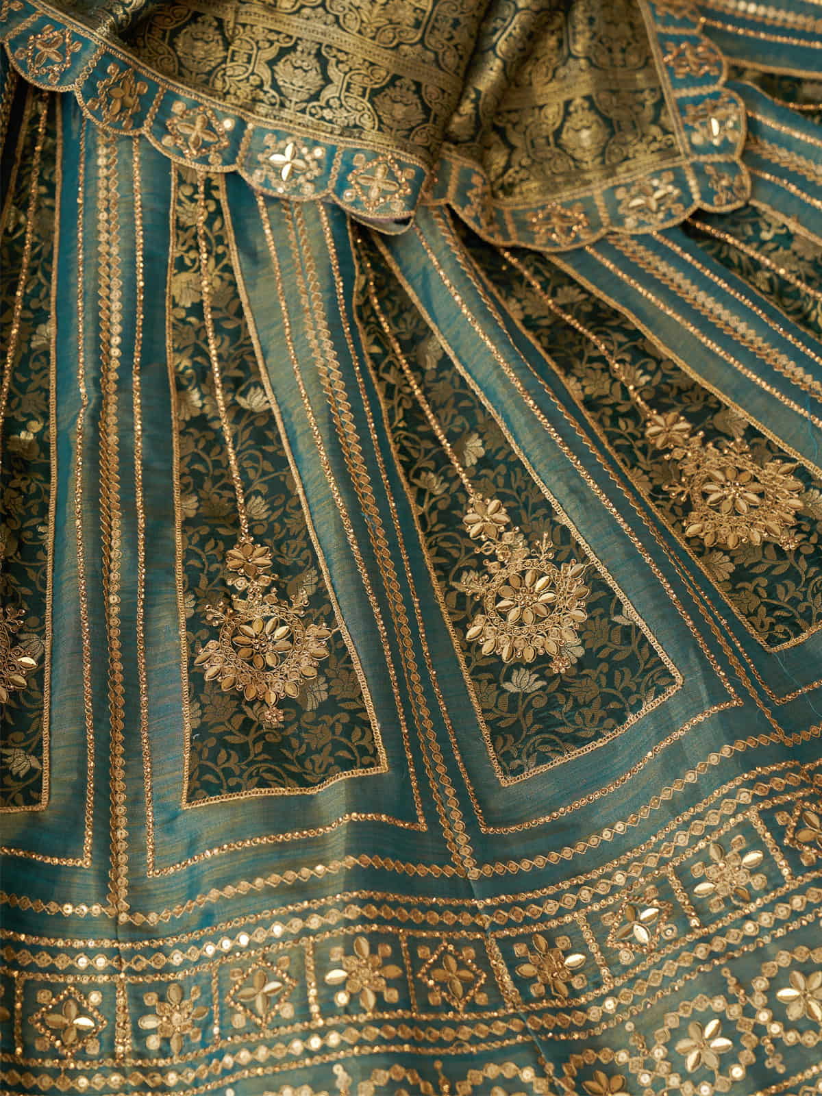 This exquisite bridal lehenga features a green tissue base crafted from premium tissue fabric, known for its soft, sheer texture and subtle metallic sheen that beautifully reflects light. Enhanced with Banarasi silk fabric patches showcasing intricate floral and paisley motifs embroidered in golden zari, it combines traditional artistry with luxurious appeal. Ideal for weddings, receptions, and festive occasions, this lehenga offers a sophisticated blend of elegance and cultural heritage.