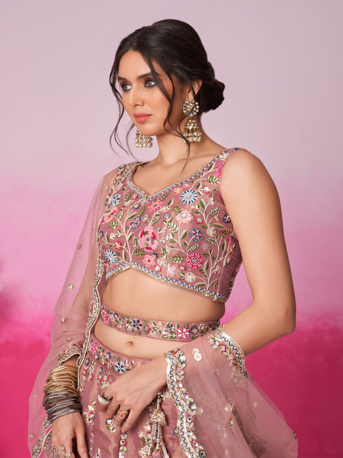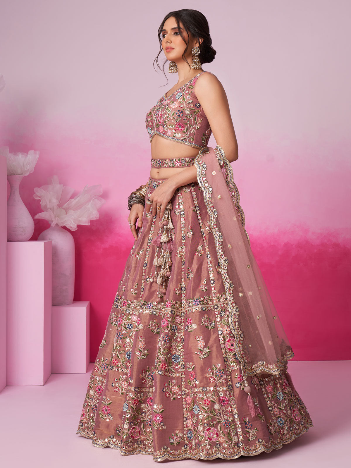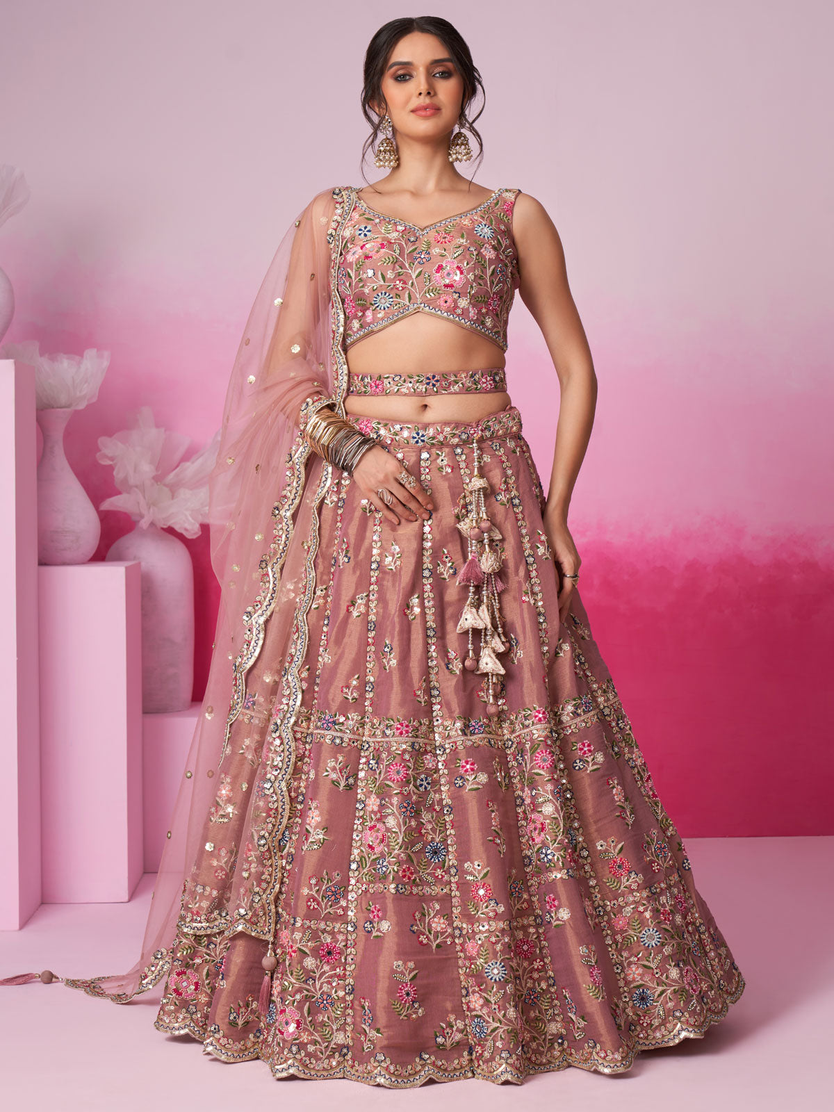 Experience a touch of elegance with our stunning Rose gold Bridel Net Moti Lehenga choli and Dupatta. Made from high-quality fabric, this semi-stitched Lehenga features delicate Moti, Mirror, and Sequins embroidery, with a Sequin cutwork border for added charm. The Dupatta also boasts intricate Sequin embroidery, making it a perfect match for the heavy embroidered blouse with a sweetheart neckline. With a comfortable inner lining and perfect waist belt, this Lehenga set brings together style and comfort.