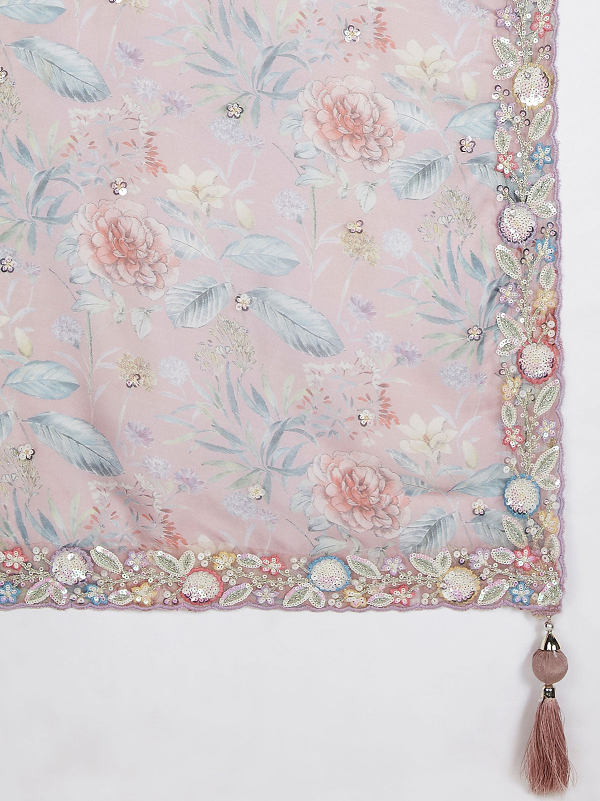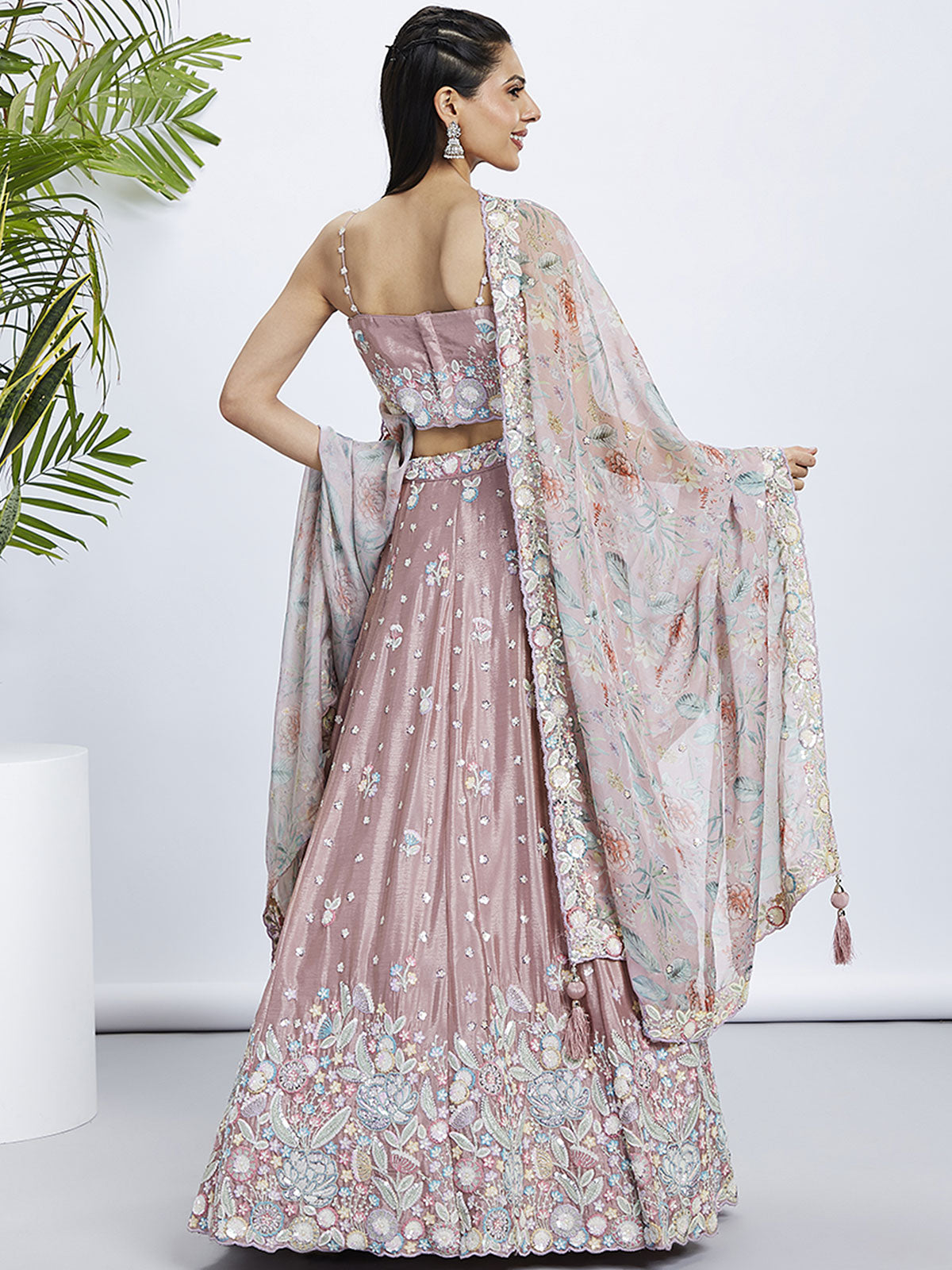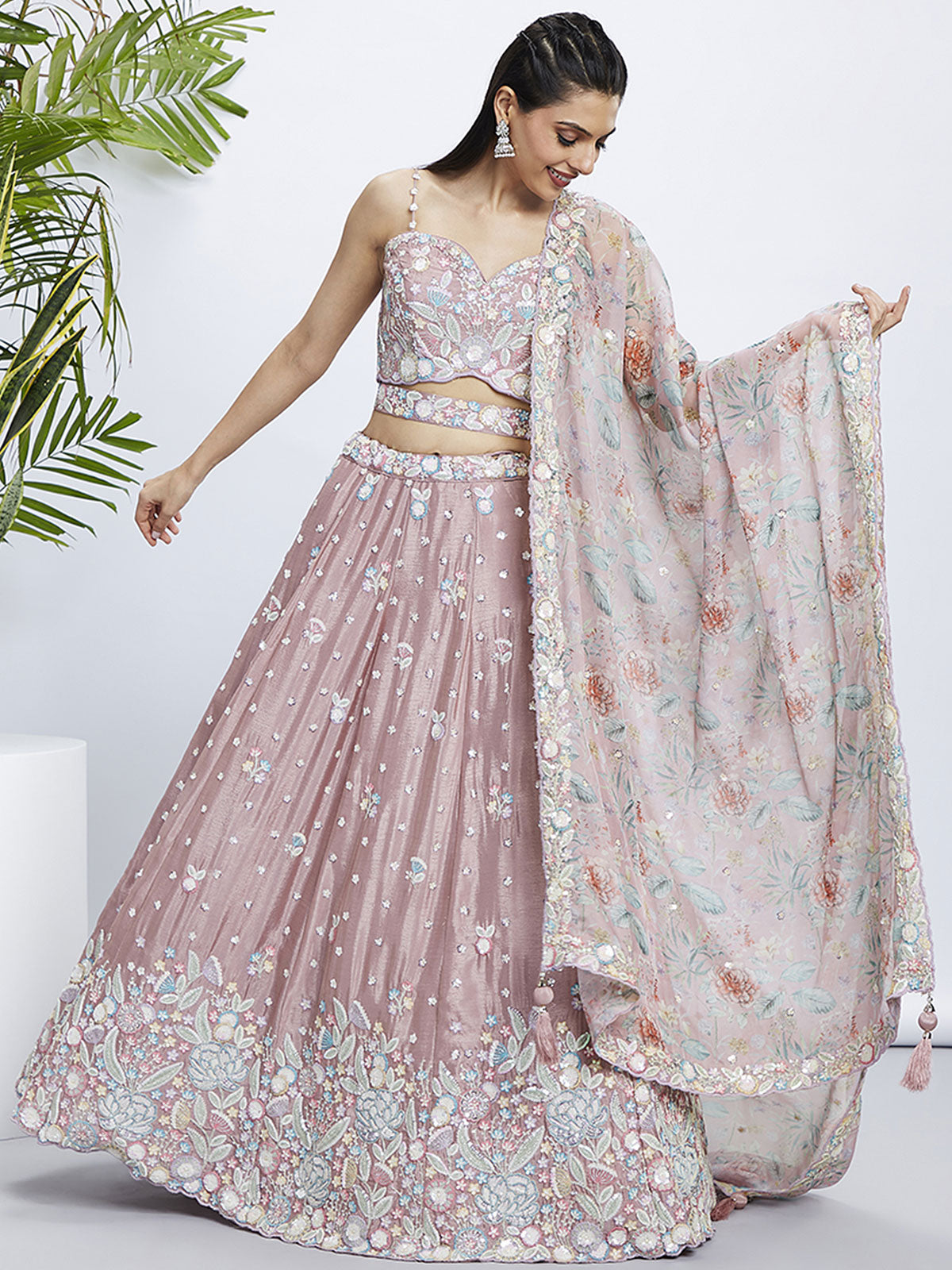 Indulge in the luxurious elegance of our Rose gold Chiffon Sequins and thread embroidery Lehenga choli & Dupatta. Made from premium quality fabric, the semi-stitched lehenga features full flaire with exquisite sequin and embroidery work, while the dupatta boasts a stunning digital print and tassels. The accompanying blouse is adorned with heavy sequin and thread embroidery, giving you the perfect access to stand out.