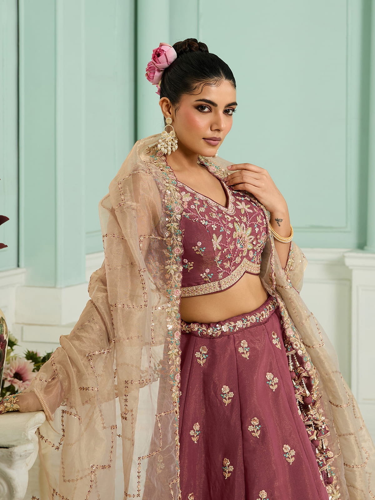 Lehenga:- Made of premium quality Roseold Color with Georgette fabric Full Flaire Semi-Stitched Lehenga With sequins and stone and Coding work has a thread Embroidery work. Has a thread cutwork border on the hemline.