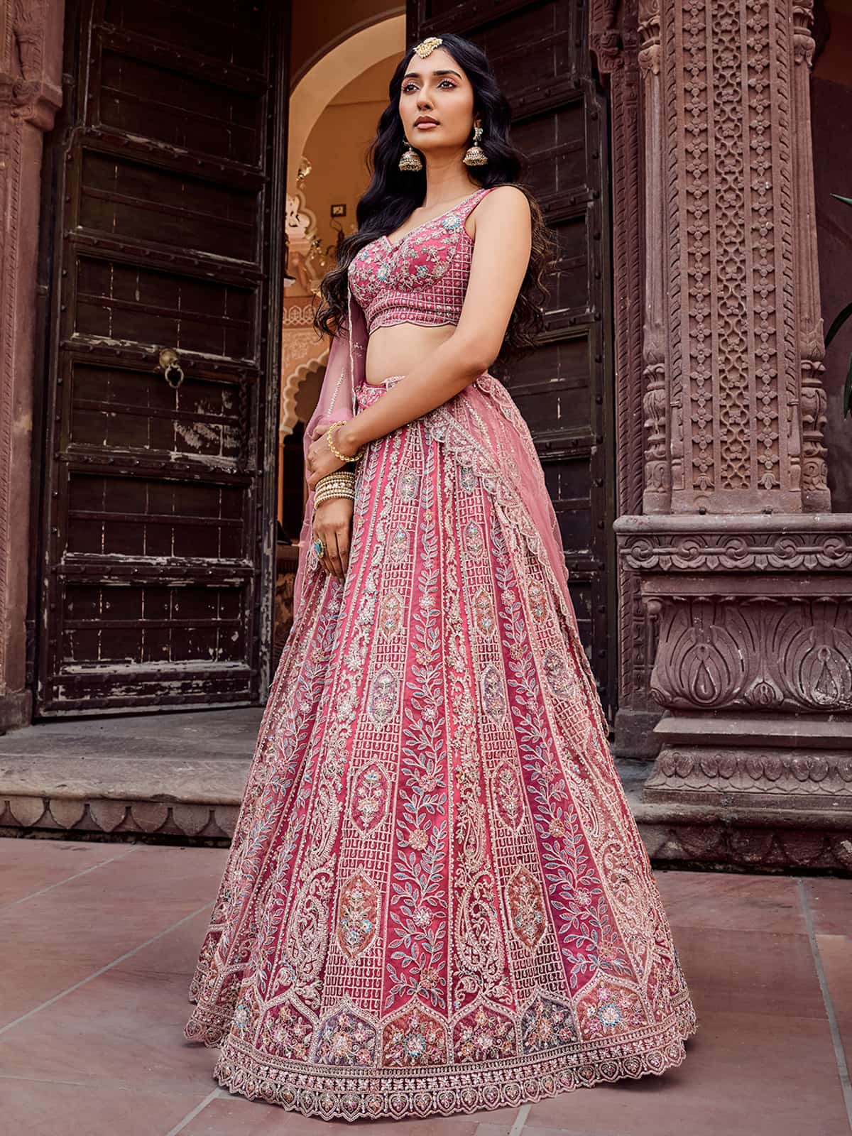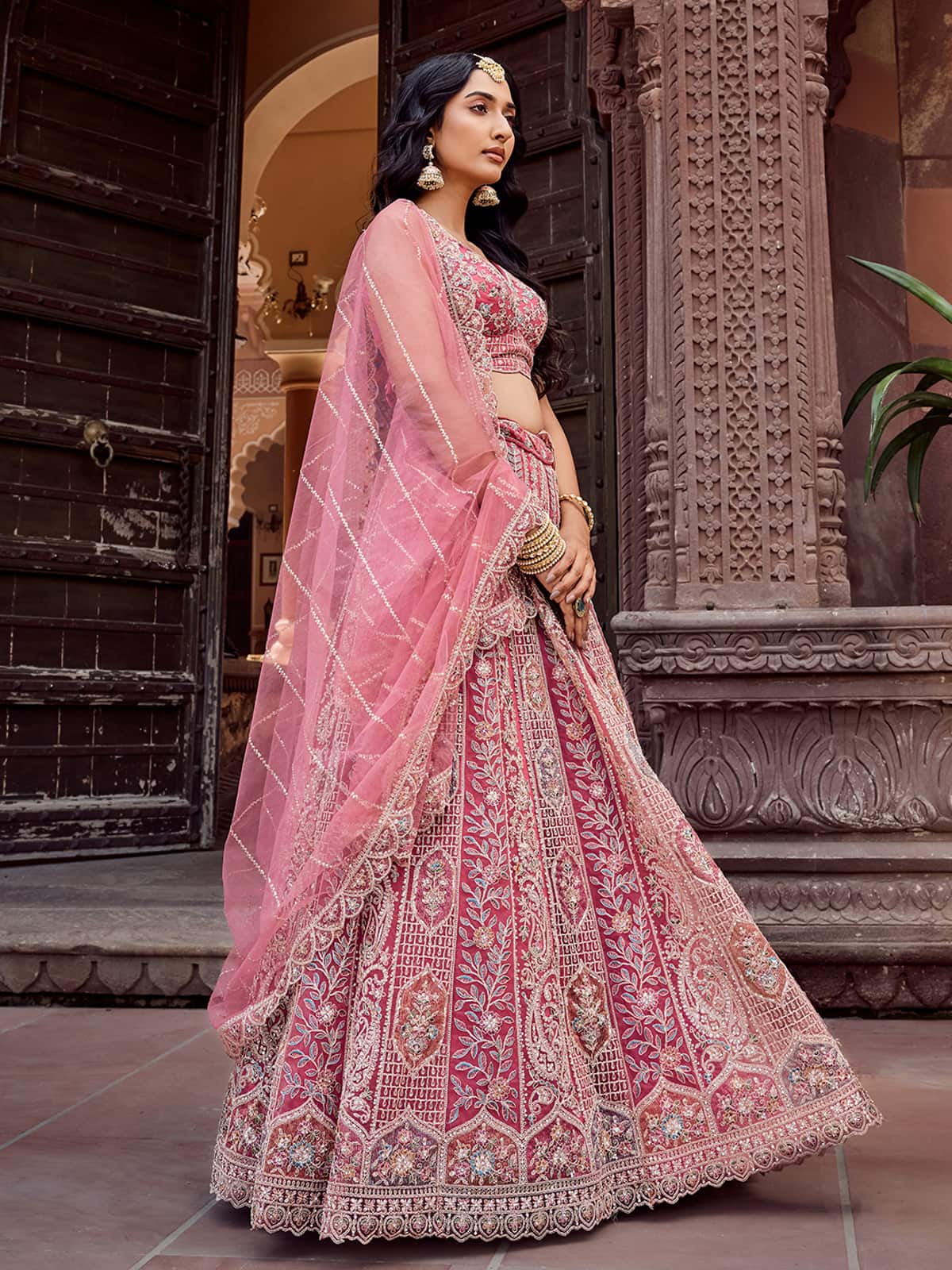 Elevate your ethnic wardrobe with this exquisite rosegold lehenga ensemble. The semi-stitched lehenga features luxurious net fabric adorned with intricate sequin work, stone embellishments, and detailed thread coding throughout. A decorative cutwork border graces the hemline, while the structured interior includes a shantoon lining with layered buckram and can-can support for an impressive 3.5-meter flare. The matching net dupatta showcases heavy coding and embroidered cutwork detailing for added sophistication. The unstitched blouse in rosegold net presents a flattering V-neckline, embellished with sequins, coding, and fine thread embroidery. Complete with attached shantoon lining, this three-piece set combines traditional craftsmanship with contemporary elegance.