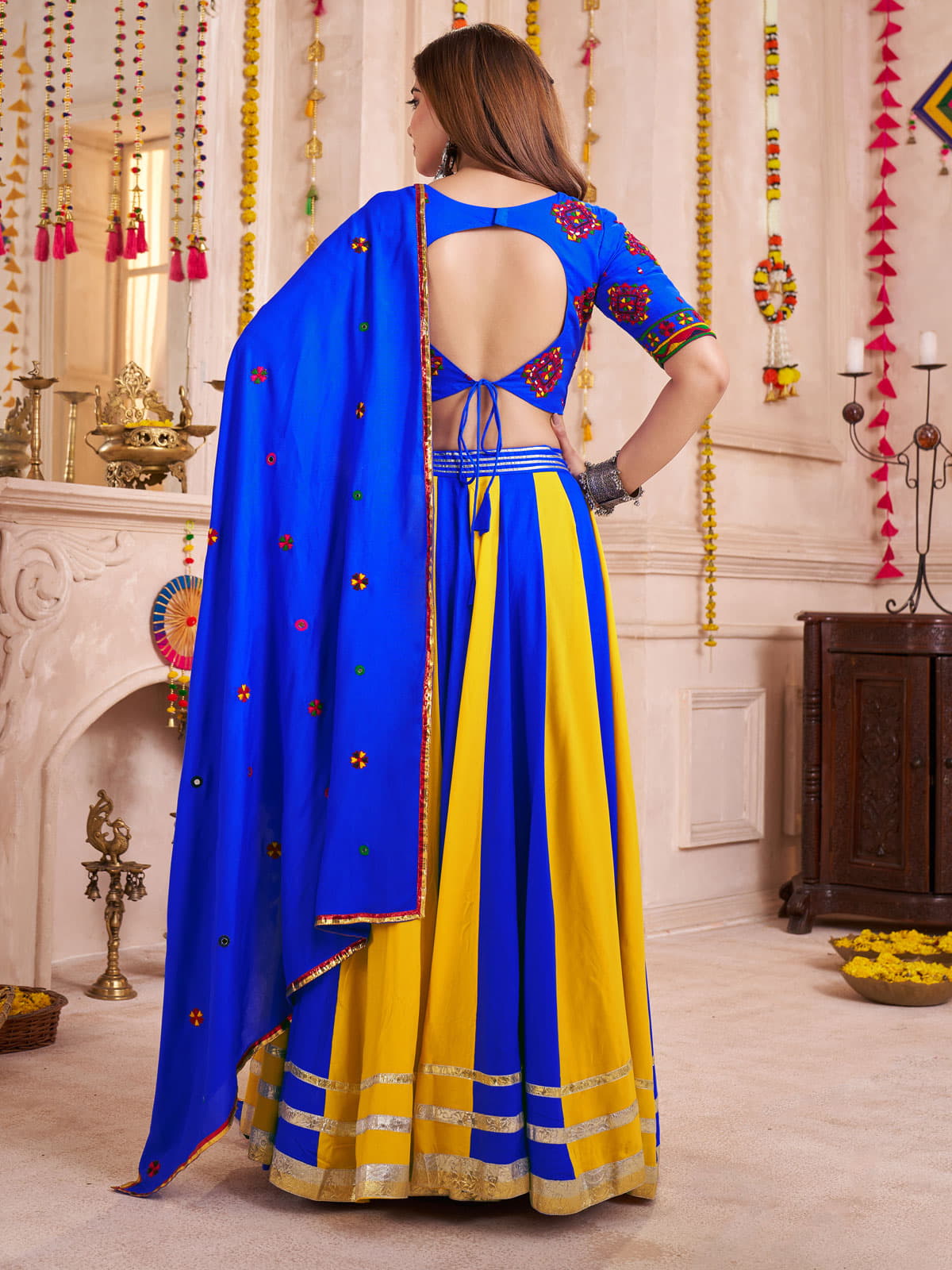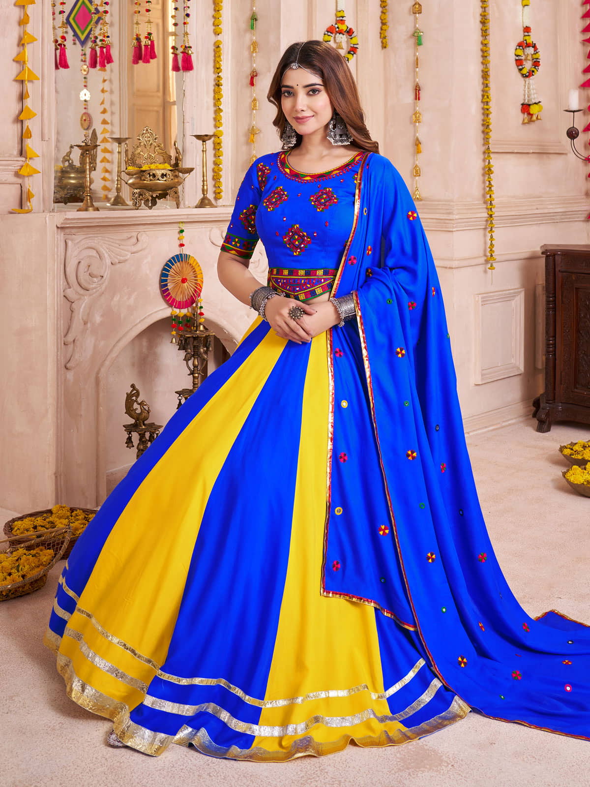 This Royal Blue Cotton Lace Work Festival Wear Lehenga Choli is crafted from premium viscose cotton, featuring intricate multi-thread embroidery and delicate mirror work. The bold blue and yellow panels, highlighted with lampi lace borders and a golden hemline lace, create an elegant and festive look. With a 9.5-meter flair, the lehenga offers graceful movement ideal for Garba and Dandiya Raas. The choli showcases traditional embroidery with a modern deep-cut back and tie-up strings for comfort and style, making it a perfect choice for Navratri and other celebrations.