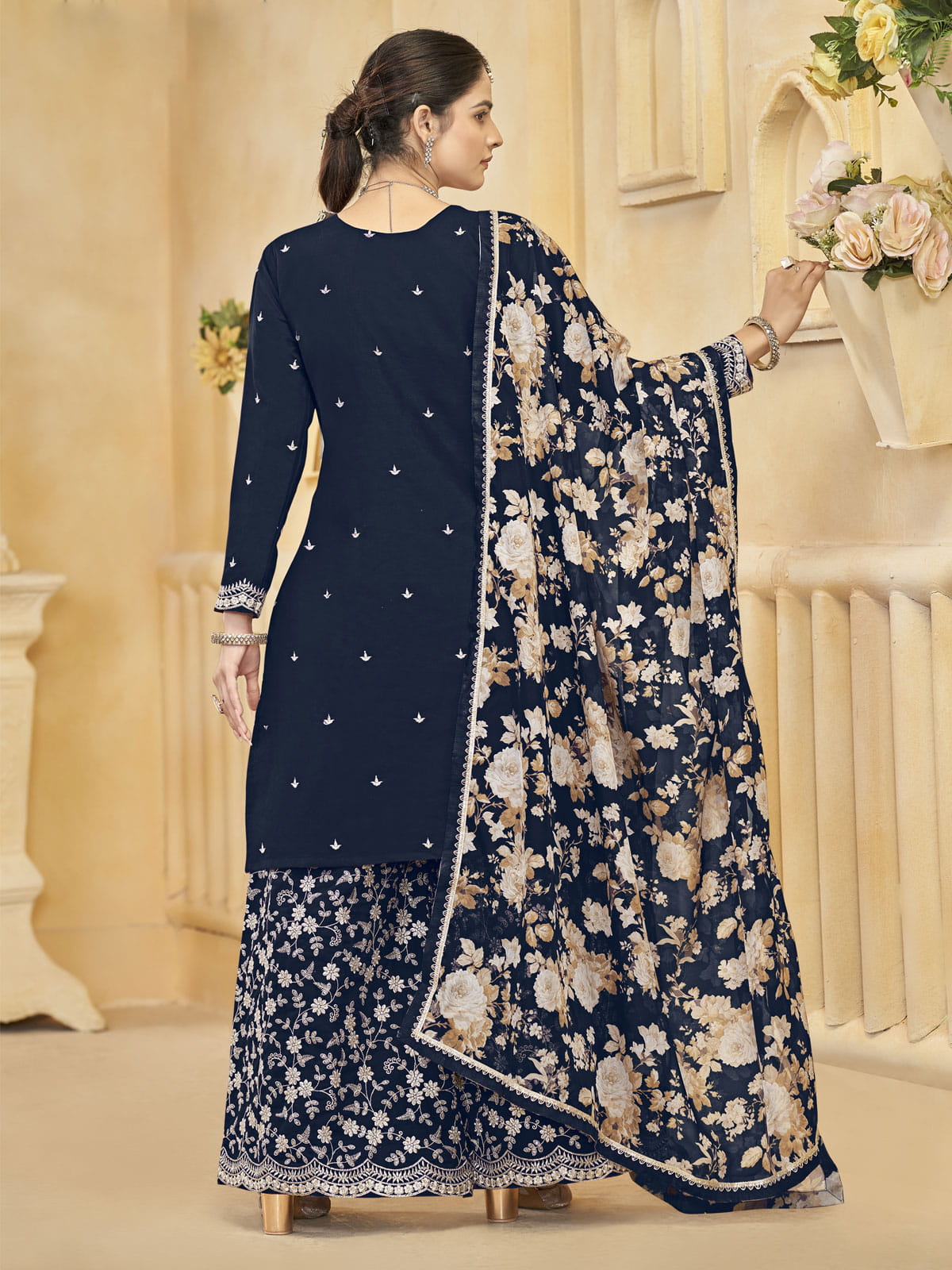 This Royal Blue Gharara Style Palazzo Suit is the perfect choice for any festive or wedding occasion. Crafted with traditional resham thread and sequence embroidery on a silk top and floral silk gharara palazzo bottoms, this set exudes elegance and ethnicity. With an all-over embroidery border and butti enhanced silk dupatta, you'll look stunningly gorgeous in this wedding season. Pair with sterling jewelry and heels for a truly regal look.