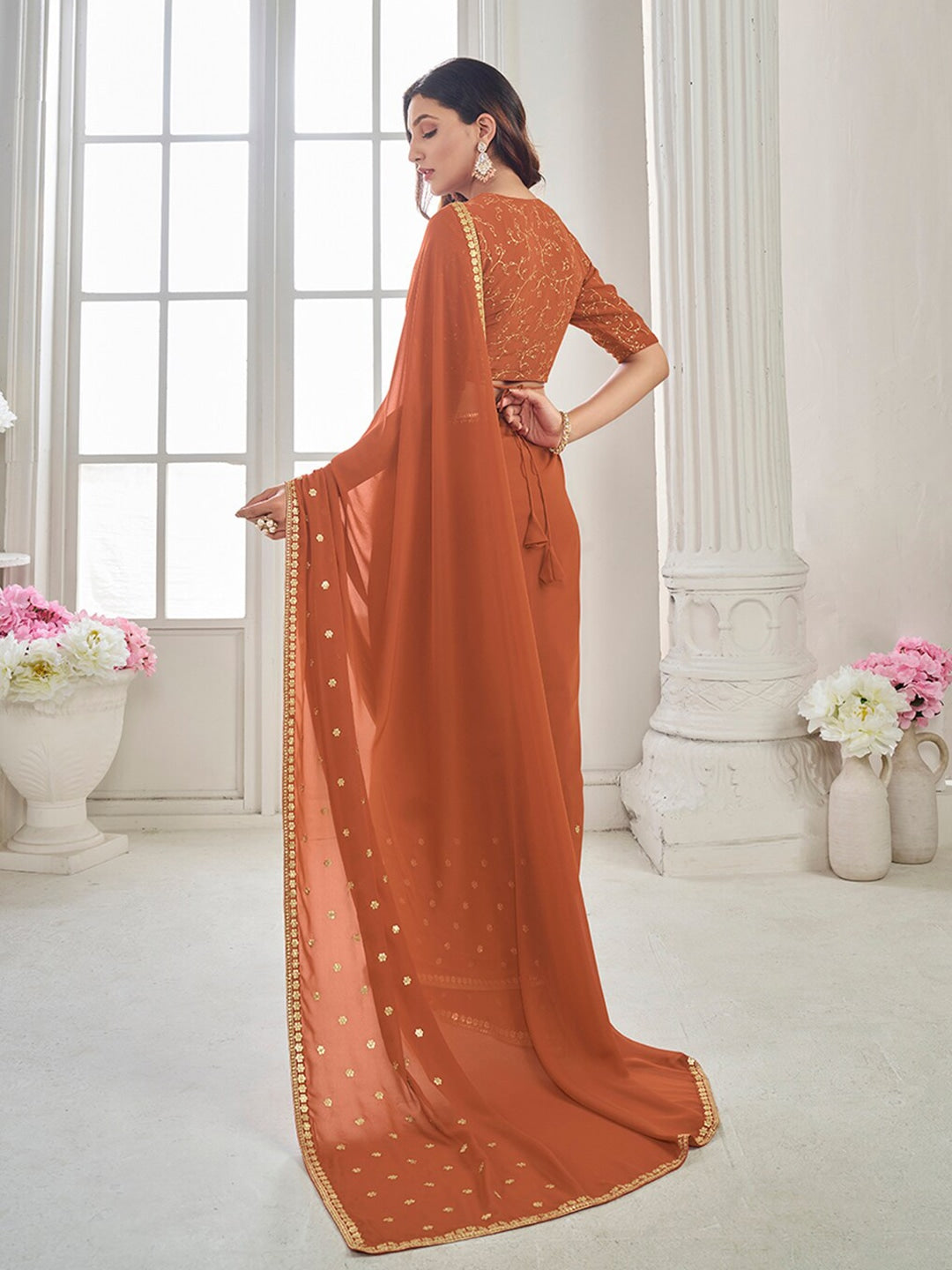 This rustic saree features golden ethnic motifs and a delicate embroidered border, adding a touch of elegance to any occasion. The sequinned details add a hint of sparkle, making it a perfect choice for special events. Comes with an unstitched blouse piece for added versatility.