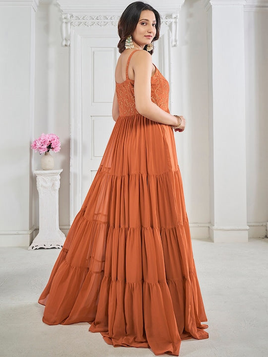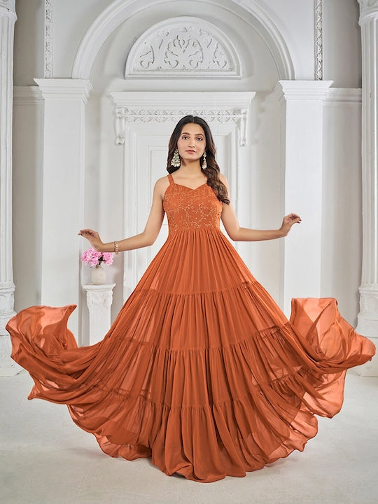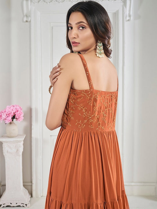 This elegant maxi ethnic dress features stunning rust-orange and gold tones, highlighted by intricate floral embroidery. The shoulder straps and sleeveless design provide comfort and style, while the tiered and sequined detailing adds a touch of glamour. Perfect for any occasion, the maxi length with flared hem will have you feeling confident and beautiful.