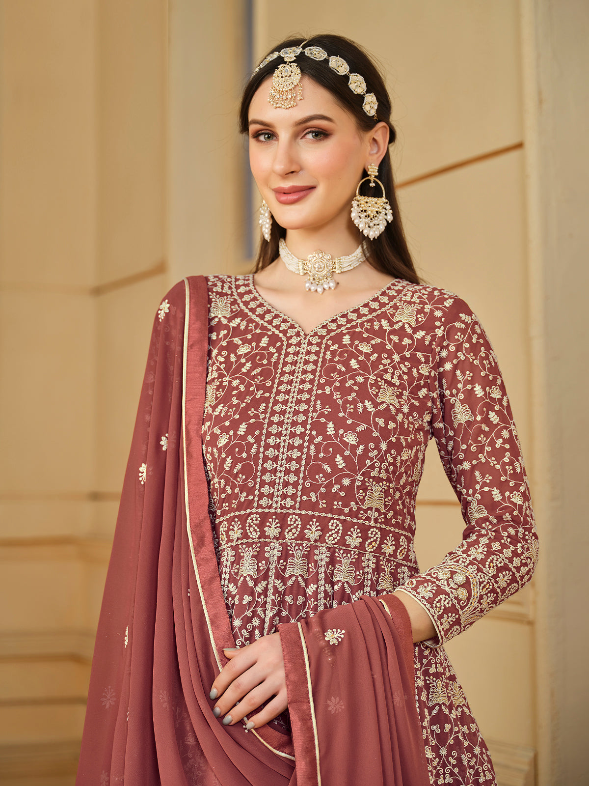 Expertly crafted for festive occasions, this Rust Thread Embroidery Georgette Anarkali Suit exudes elegance and sophistication. Intricate resham thread work, shimmering sequins, and satin border adorn the georgette anarkali top, while the silk santoon pants and dupatta add a touch of luxury. Elevate your Eid look with this stunning set.