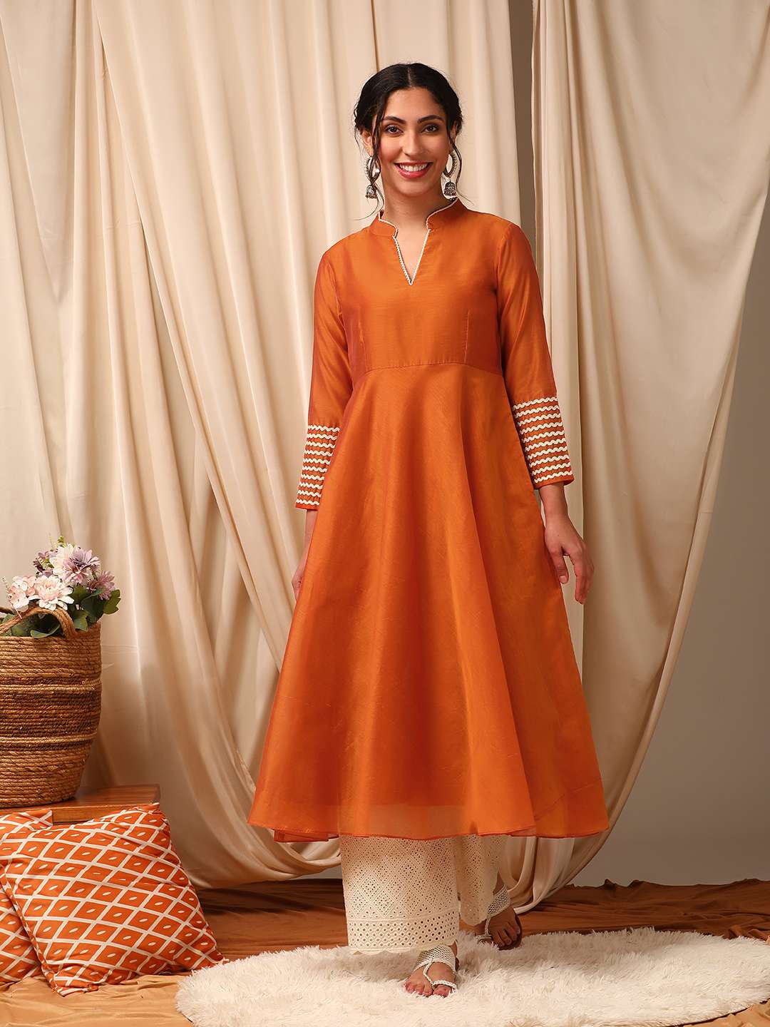 This rust-colored Anarkali Kurta features a mandarin collar and short, regular sleeves. Its pleated design and ankle length with flared hem create a flattering silhouette. With delicate beads and stones detailing, this kurta adds a touch of elegance to any outfit. Crafted from regular chanderi cotton, it offers both comfort and style.