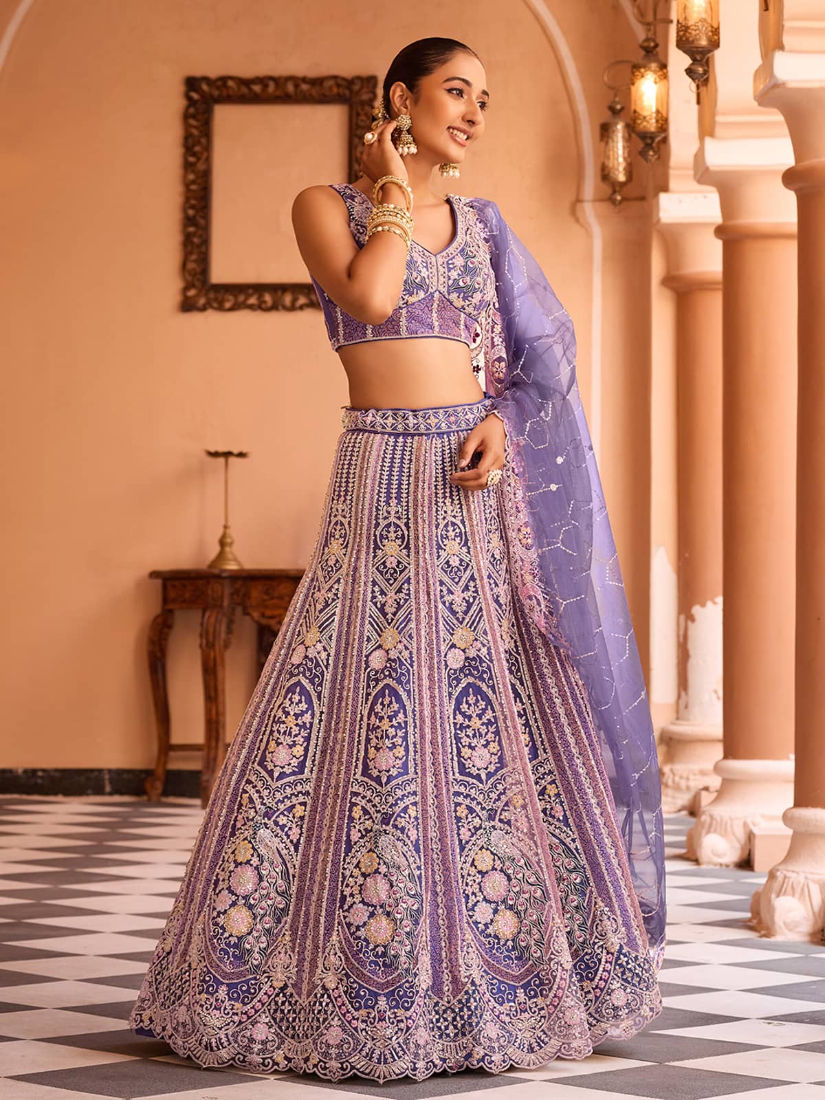 Elevate your ethnic wardrobe with this exquisite purple lehenga ensemble. The semi-stitched lehenga features luxurious net fabric adorned with intricate sequin work, stone embellishments, and detailed thread coding, complemented by an ornate cutwork border at the hemline. The voluminous 3.5-meter flair is supported by a structured inner with can-can and buckram layers for perfect drape. The matching net dupatta showcases heavy coding and embroidered cutwork detailing. The V-neck blouse in purple net is embellished with sequins, coding, and thread embroidery, complete with an attached shantoon lining. This sophisticated three-piece set combines traditional craftsmanship with contemporary design, perfect for weddings and festive celebrations.