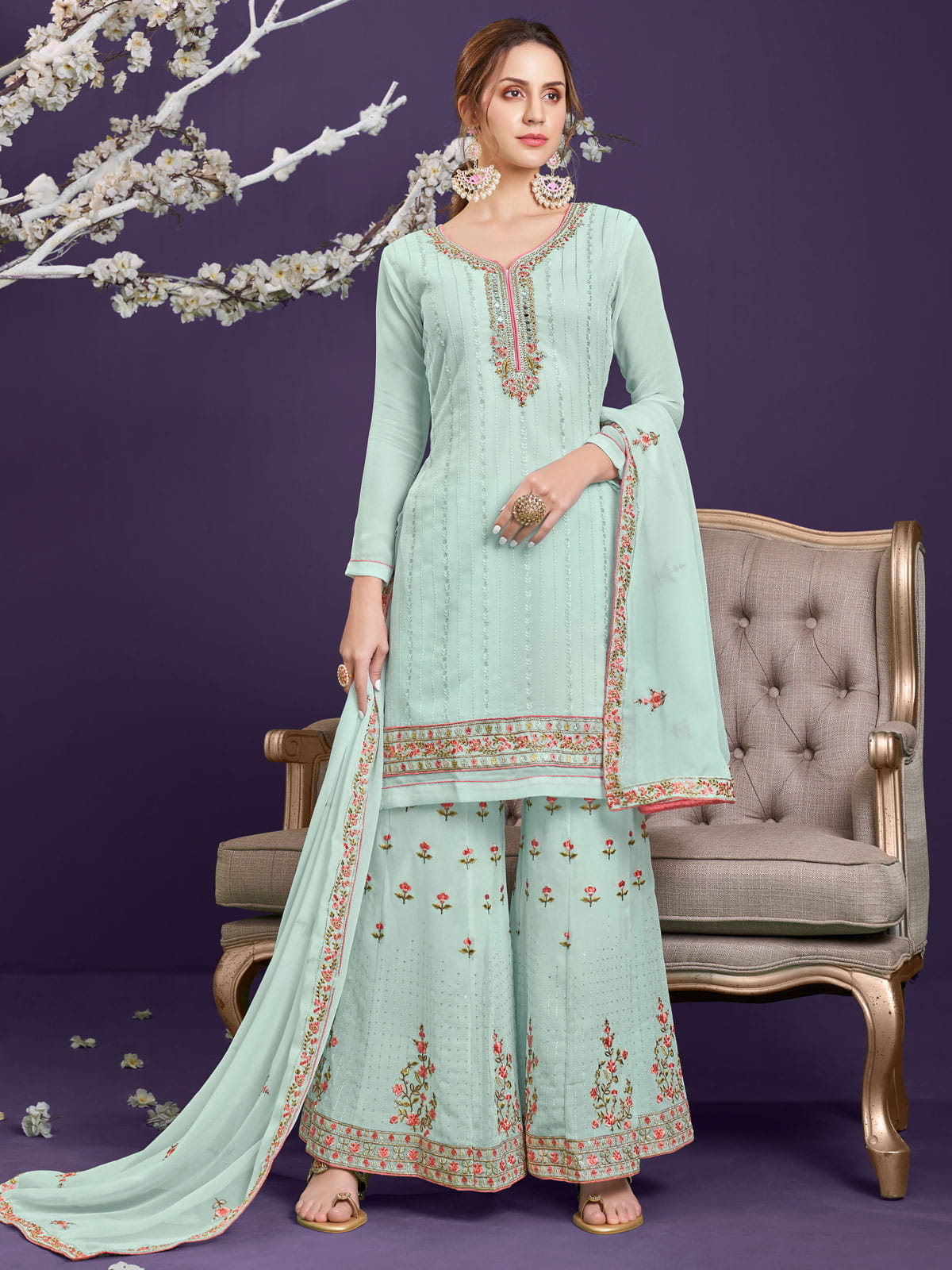 This Sea Blue Multi Embroidered Designer Palazzo Suit is expertly crafted to elevate your style. Made with straight cut pure georgette and embellished with khatli work, zari, and sequence detailing, this suit exudes elegance. The set includes a georgette pant and an embroidered dupatta. Complete the look with statement earrings and heels.