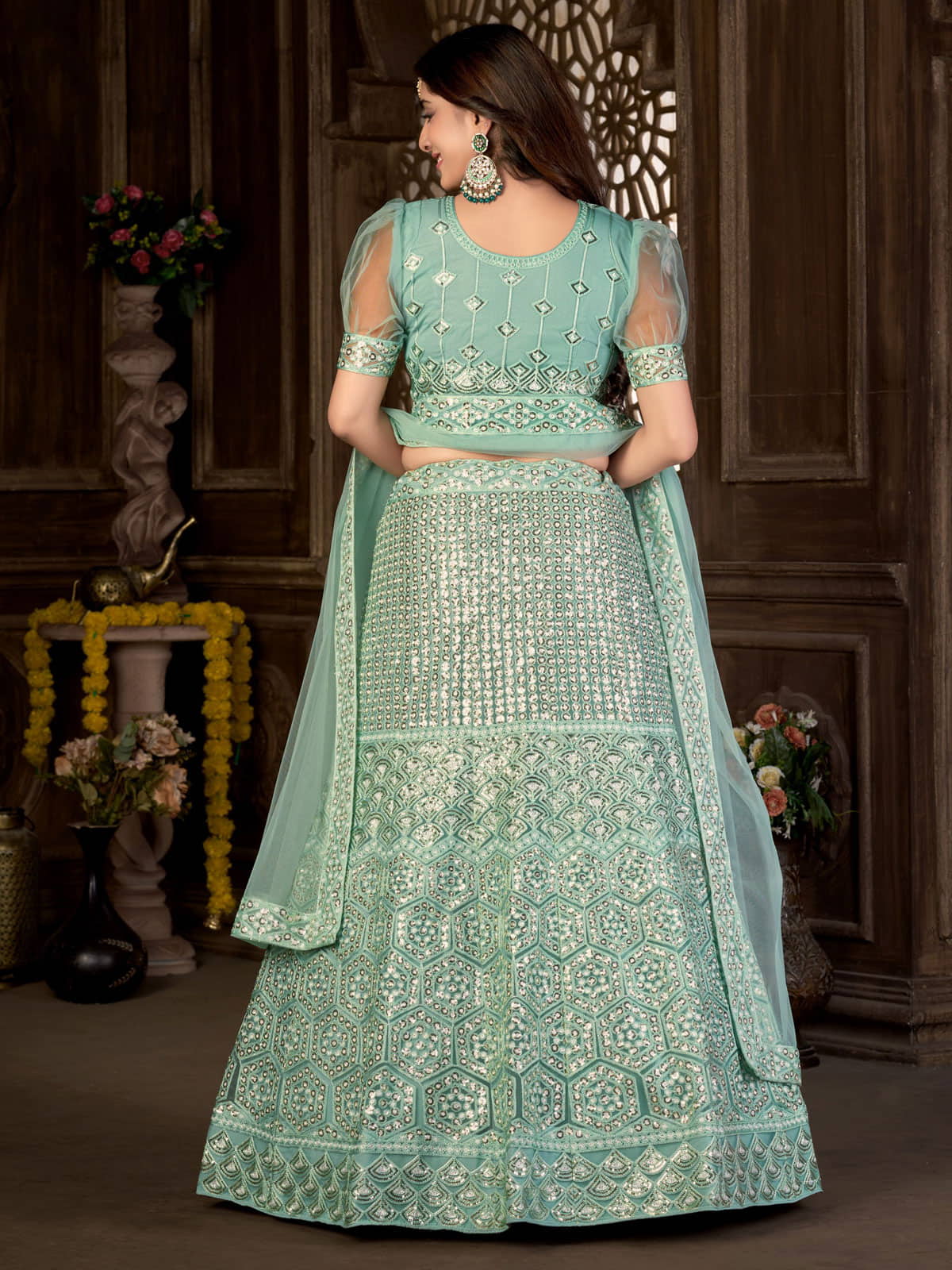 Add a touch of elegance to your festive look with this sea green net lehenga embellished with sequins and thread embroidery. Comes with a matching net choli and dupatta. Customizable choli accomodates up to 44 inches. Accessories shown for styling only.