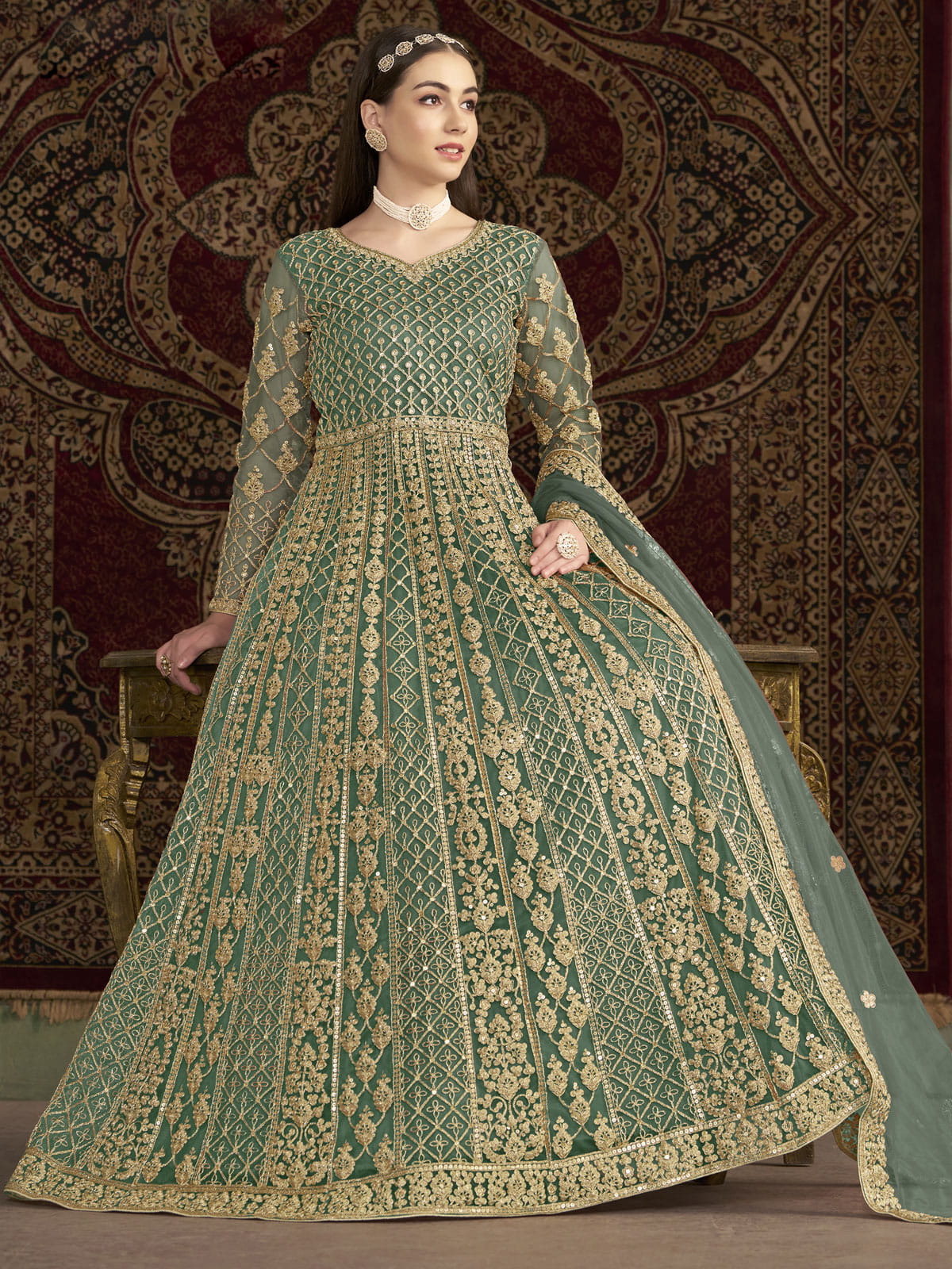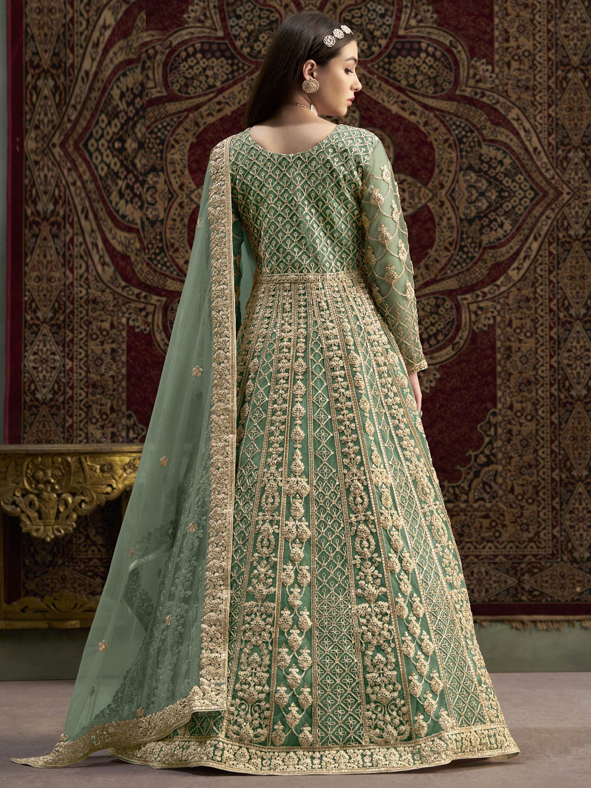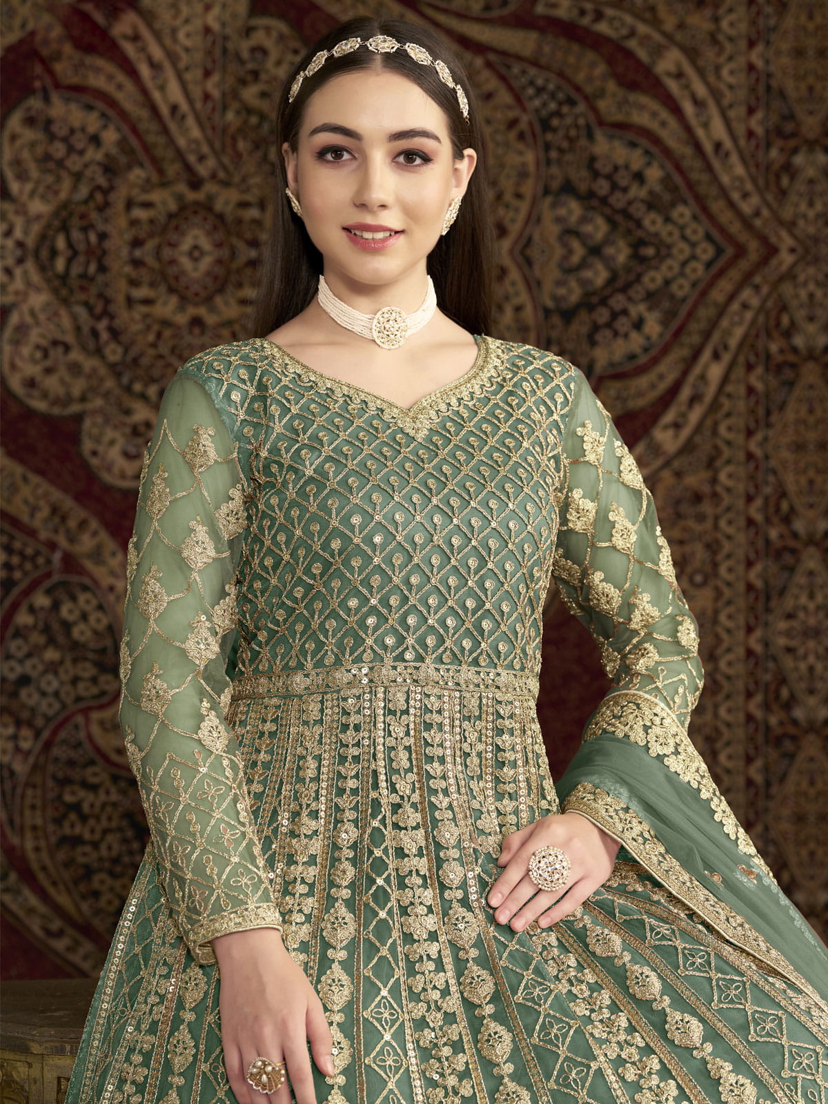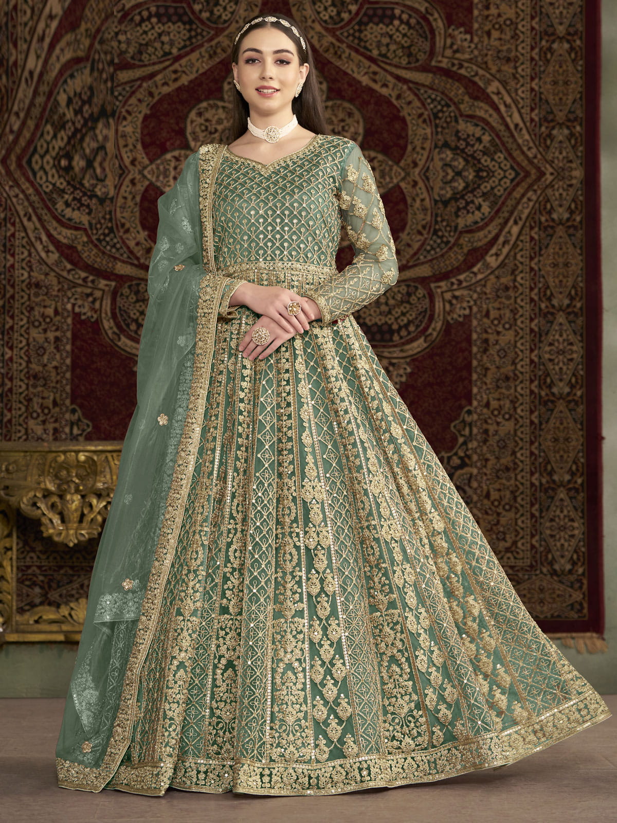Elevate your style with our Sea Green Traditional Embroidery Wedding Anarkali Suit. This exquisite Indian ethnic wear showcases intricate cording reshamkari zari embroidery and delicate sequence work on the premium net anarkali top. Paired with silk santoon pants and lining, and a heavily embellished border and butti-embroidered premium net dupatta, this outfit is perfect for the festive season. Accessorize with golden jewelry and stilettos for a stunning look at any wedding or celebration.