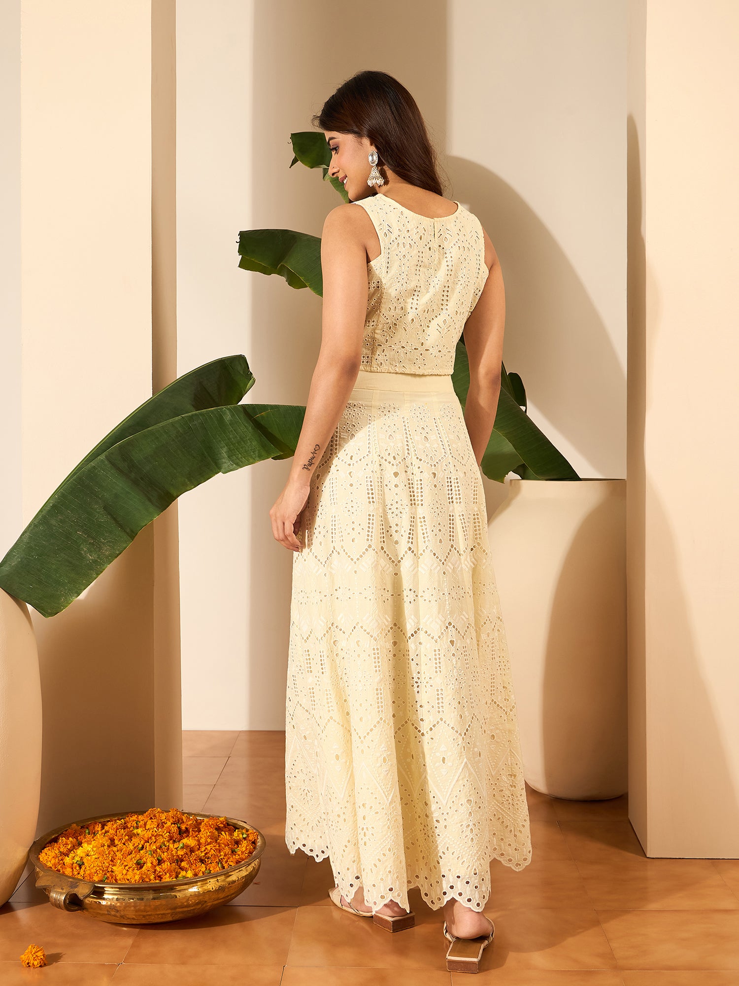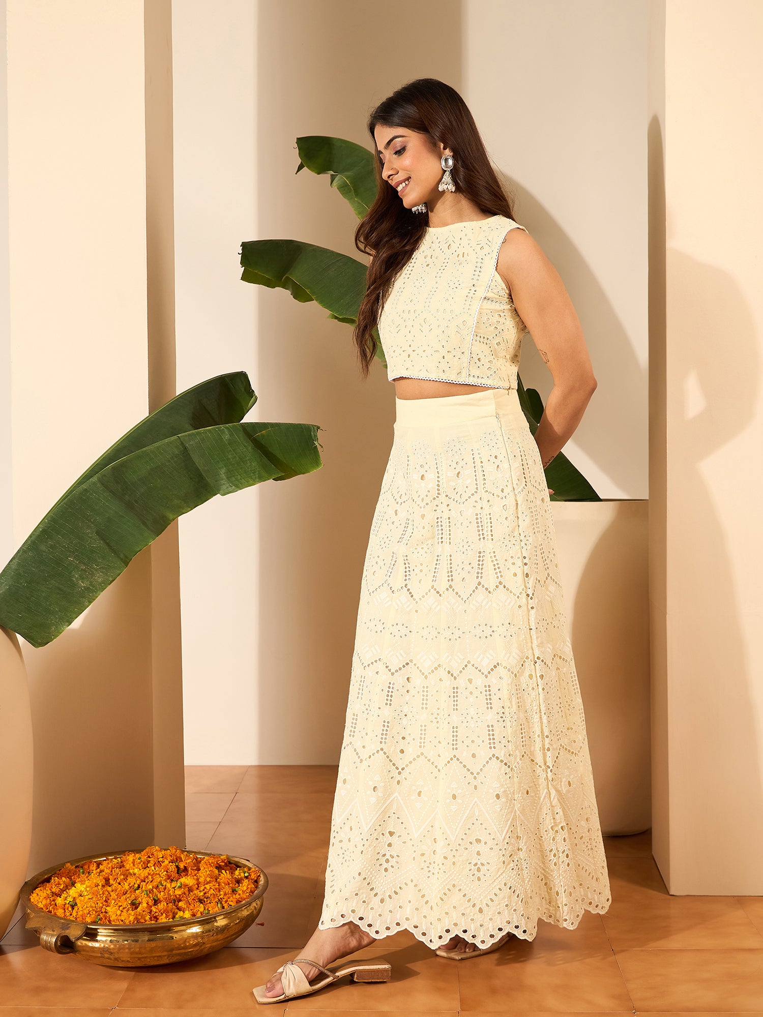 Off white & white embroidered top, has a round neck and sleeveless, secured with slip on closure