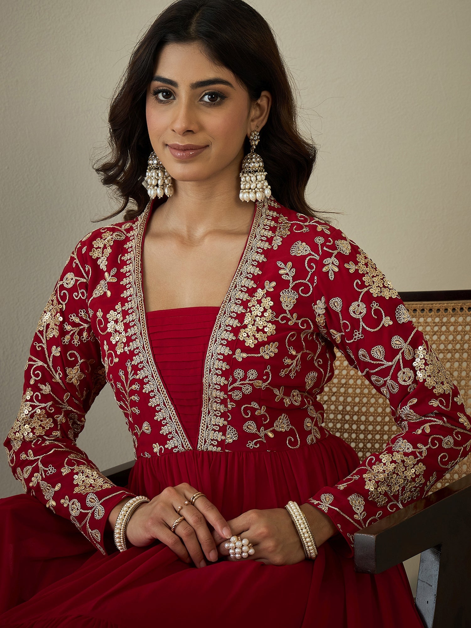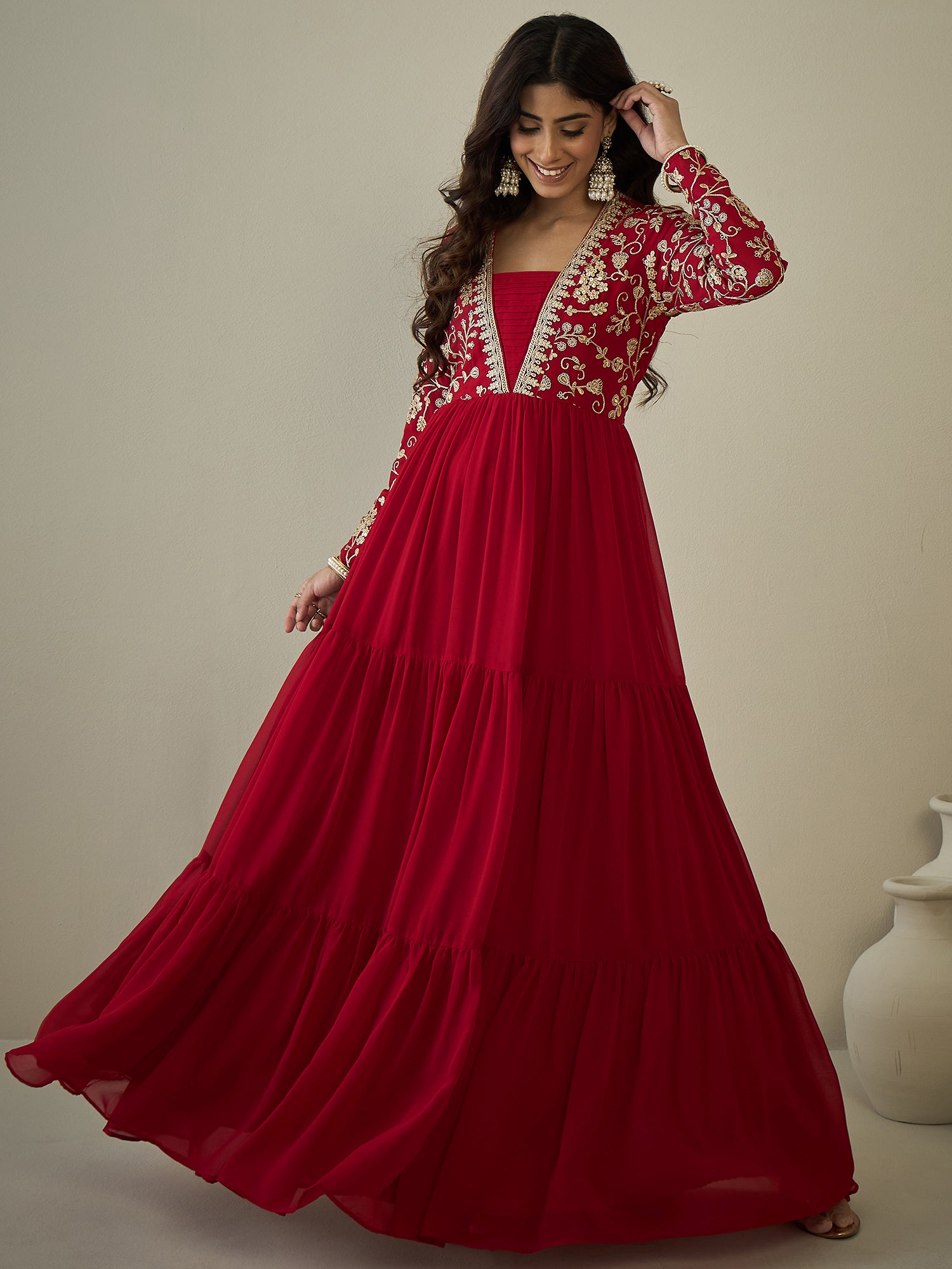Constructed with delicate sequinned embroidery, this red ethnic dress boasts a tiered fit and flared design for a flattering silhouette. The V-neck and long regular sleeves add elegant features, while the slip-on closure allows for convenient wear. Made with Georgette and Crepe materials, it's recommended to dry clean for best care.