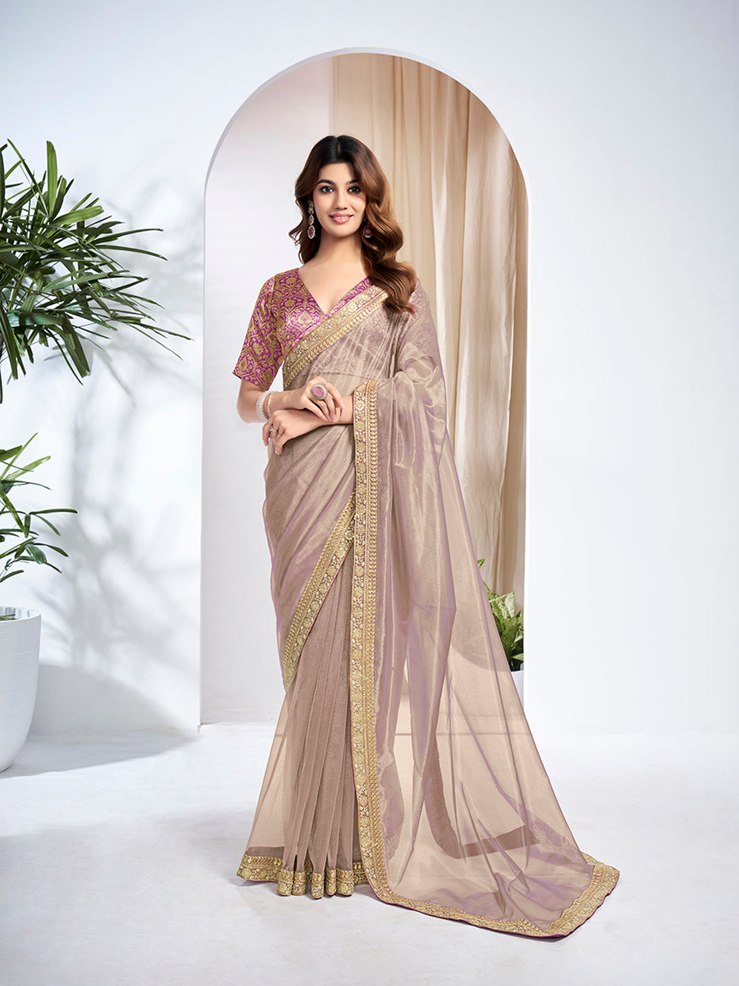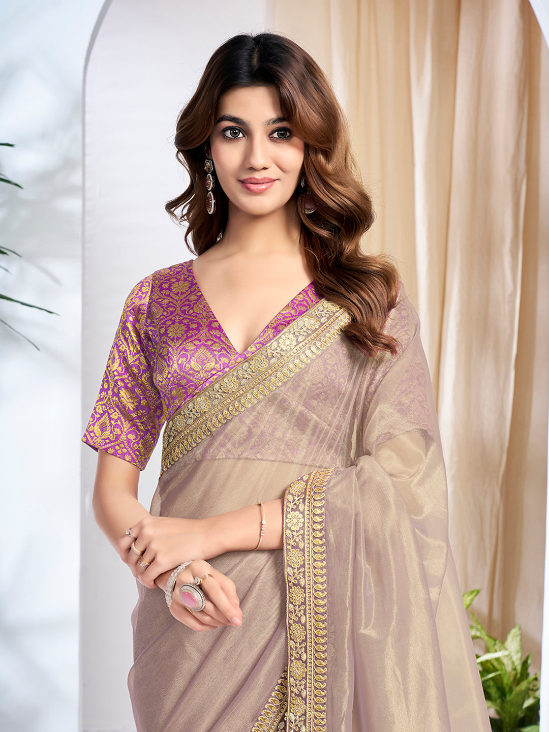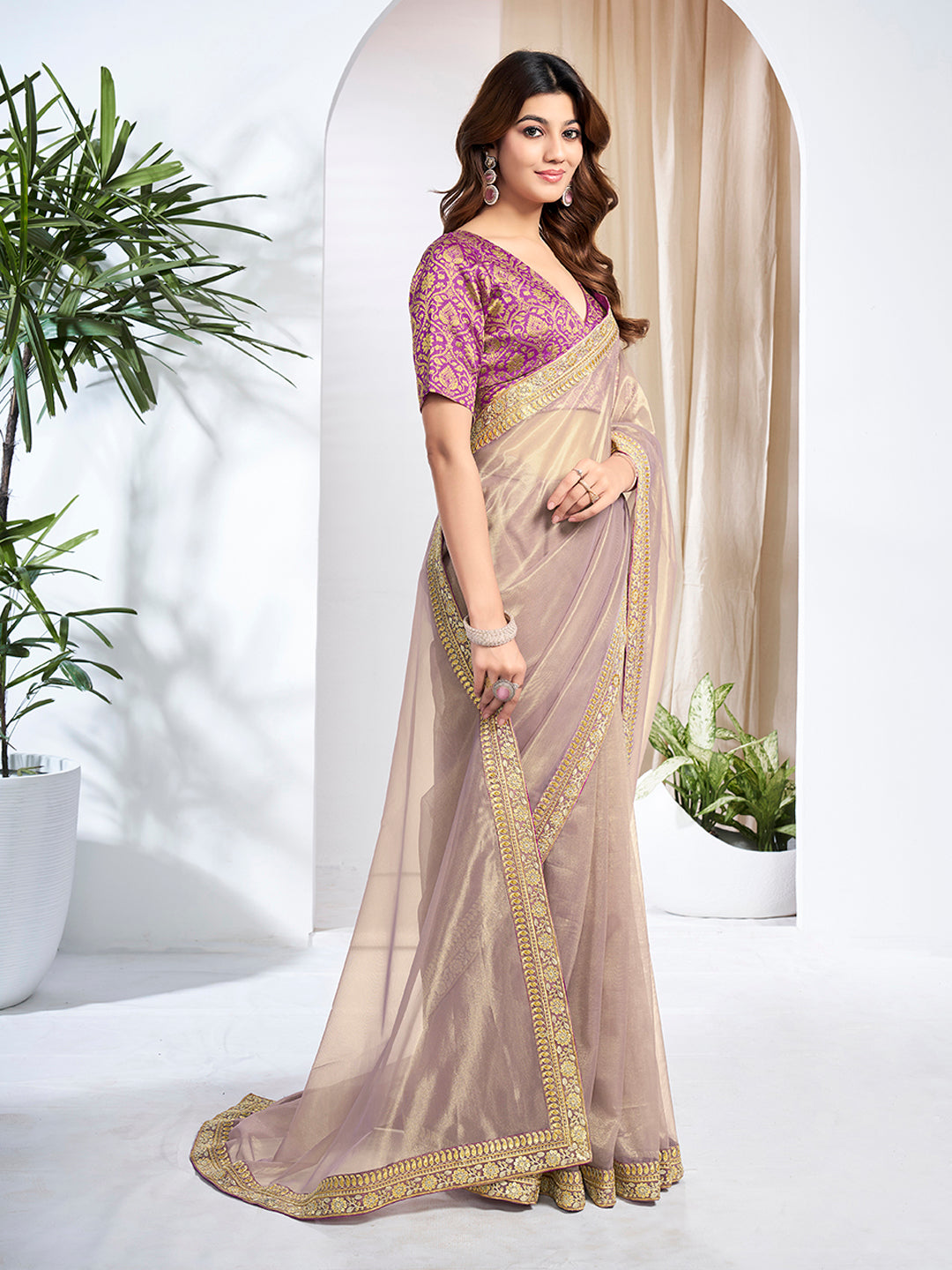 This stunning pink and beige saree features intricate embroidered borders for a touch of elegance. The sequinned detail adds a subtle sparkle to this solid saree. Comes with an unstitched blouse piece for your customization. Perfect for any formal occasion.