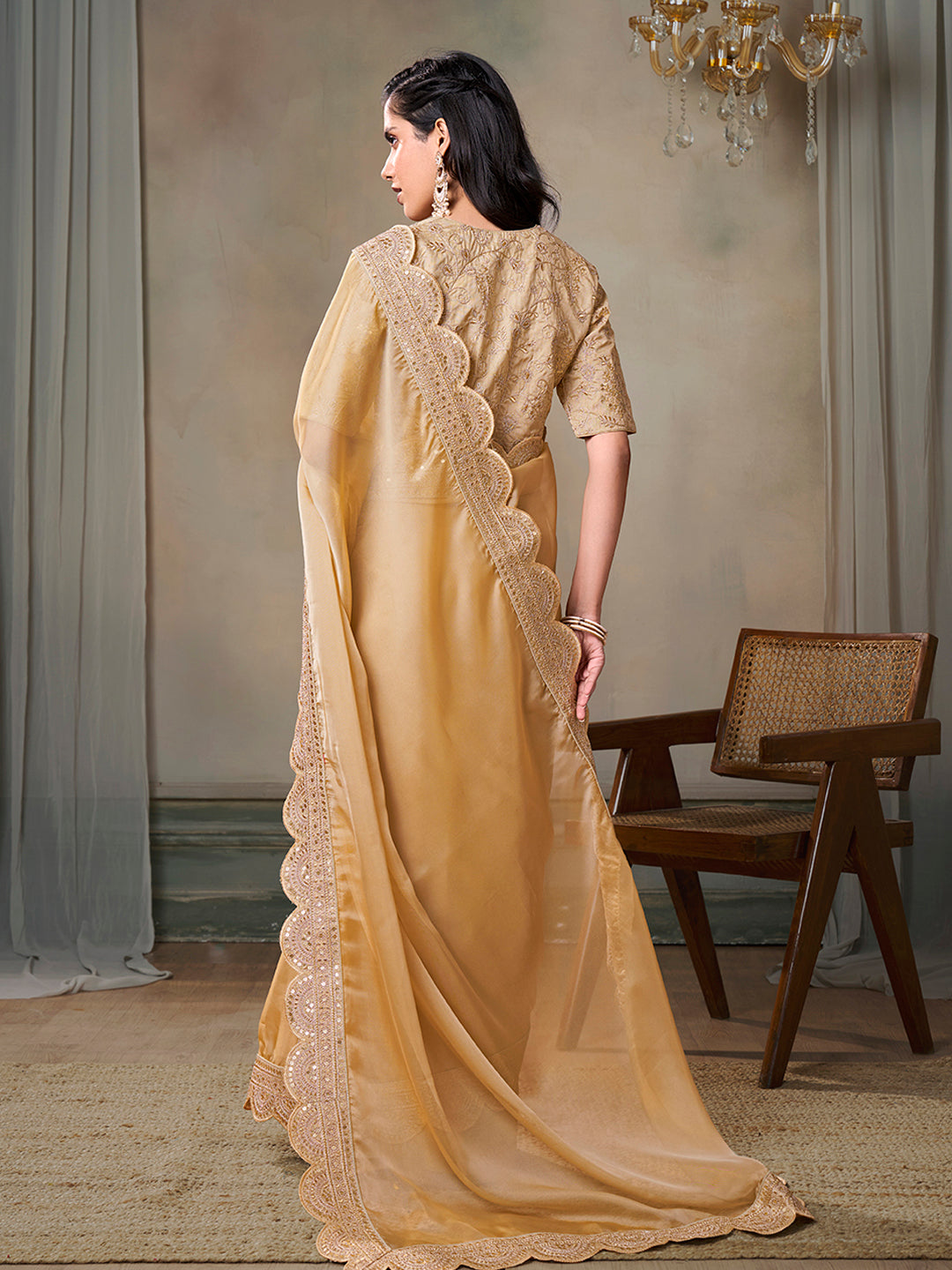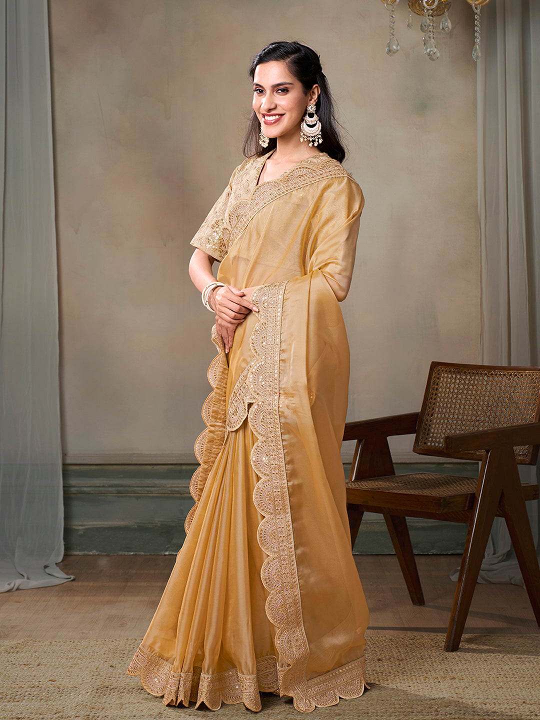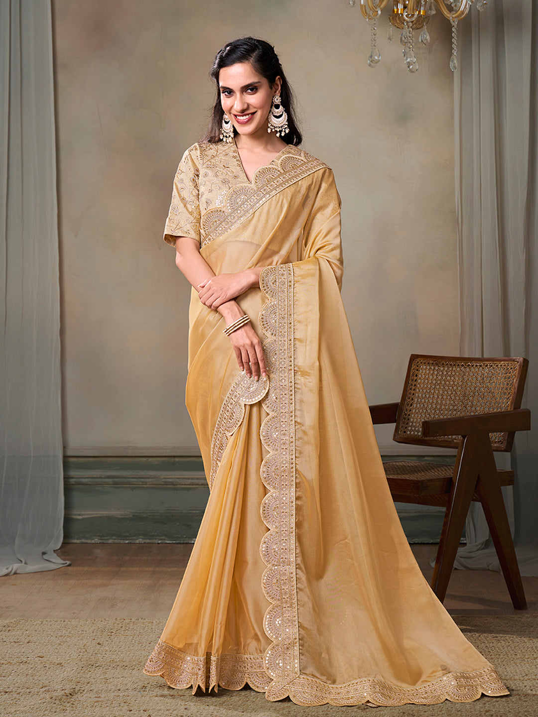 Add a touch of elegance to your wardrobe with our Sequinned Organza Saree. The solid gold-toned saree features an intricately embroidered border with sparkling sequin details. The 5.5 metre length and 0.8 metre blouse piece provide a perfect fit for most sizes. Enhance your look with this stunning piece.