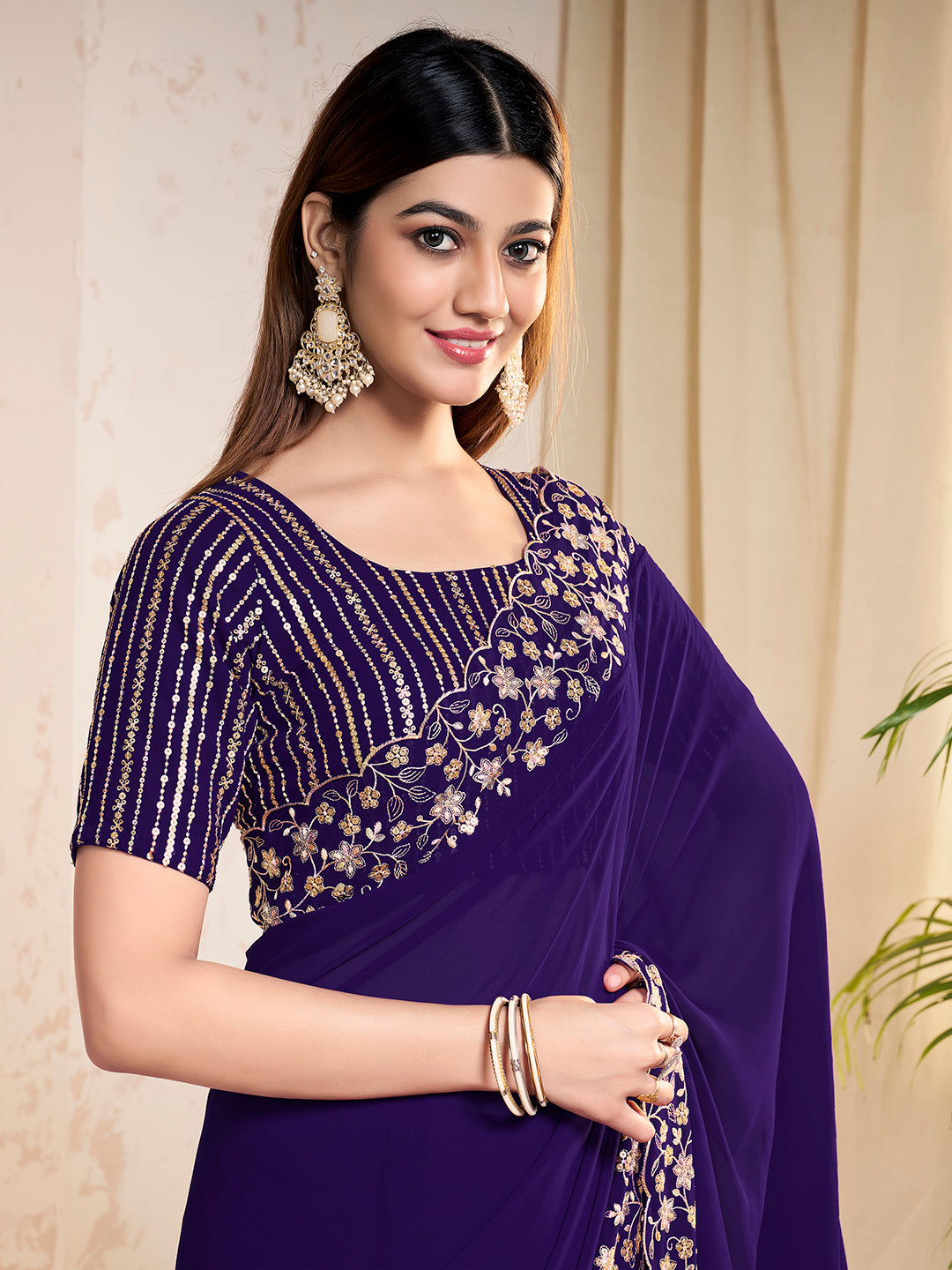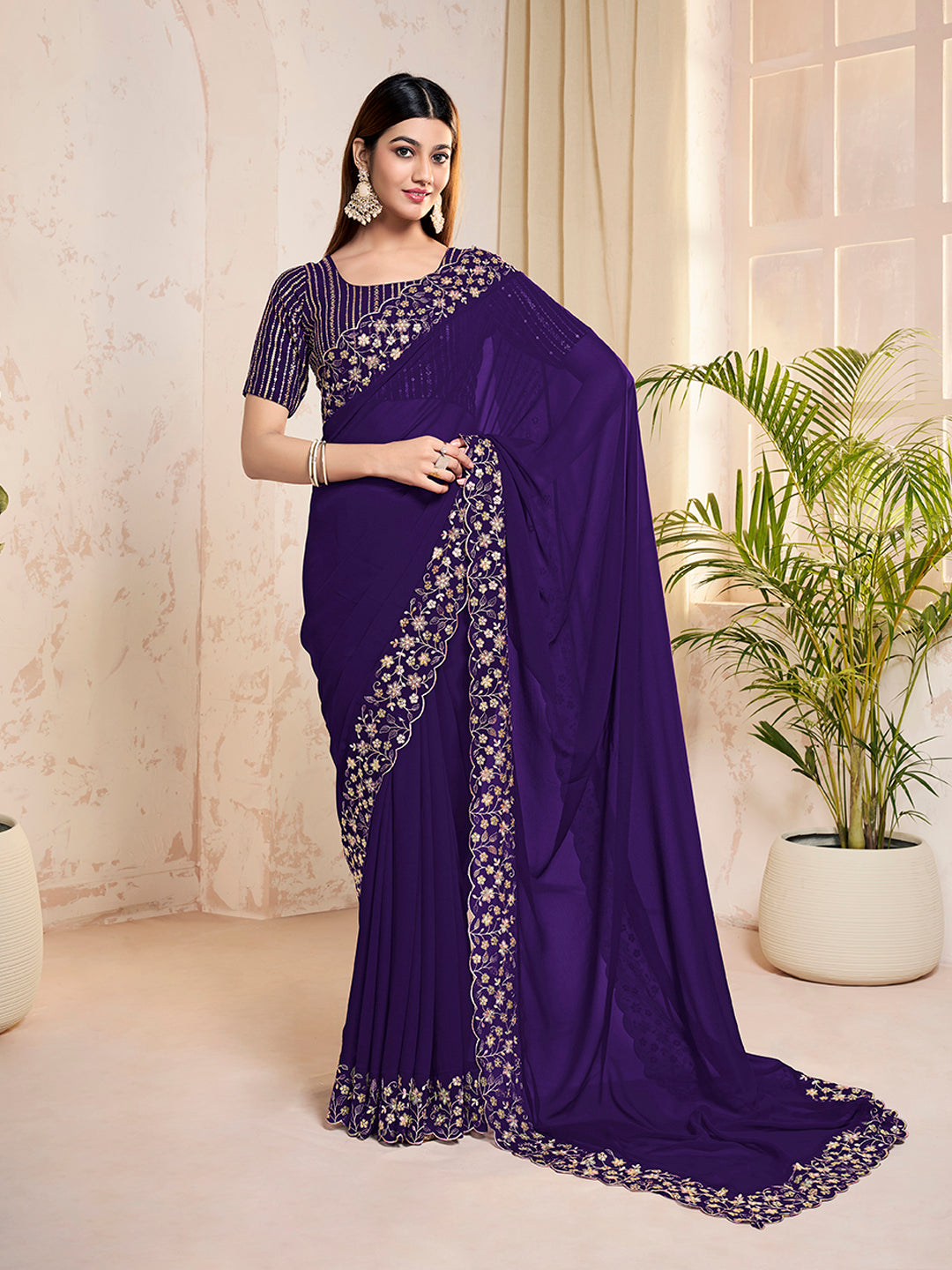 This sequinned poly georgette saree features a solid purple color with an embroidered border and intricate sequin detailing. The unstitched blouse piece allows for a customized fit. Check the image for a better representation of the blouse piece. Perfect for any formal occasion.
