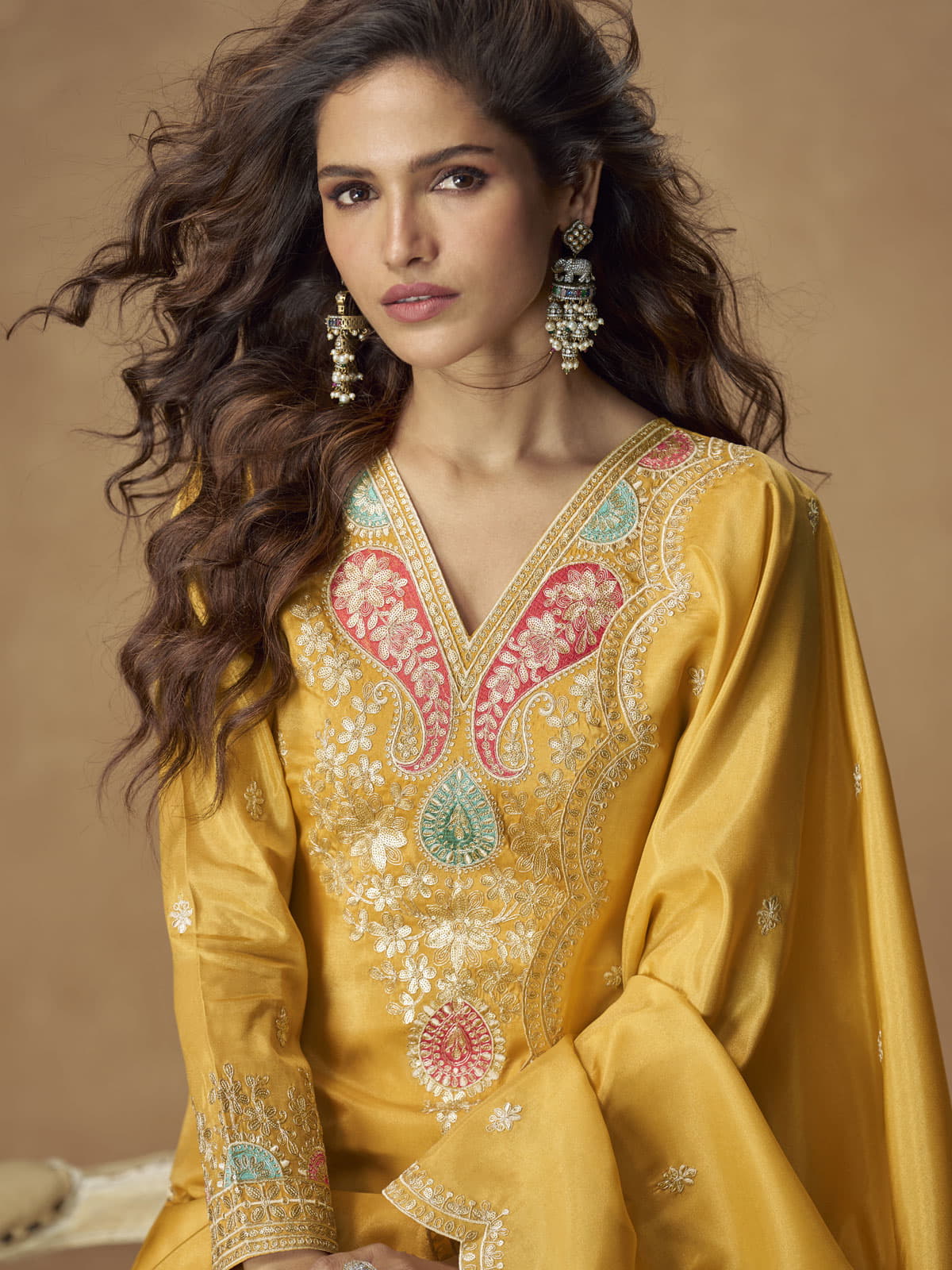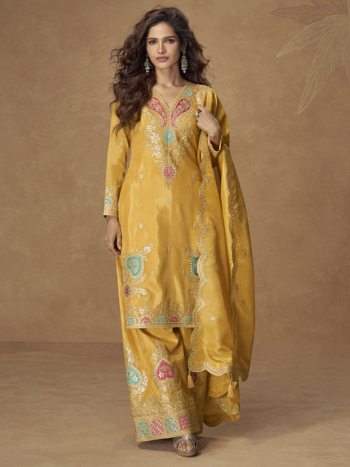 Elevate your style with this yellow shimmer palazzo salwar suit crafted from luxurious silk. The coordinated design highlights contemporary trends while ensuring a graceful silhouette. Complete with a matching dupatta, this ensemble offers a perfect blend of elegance and modernity for any occasion.