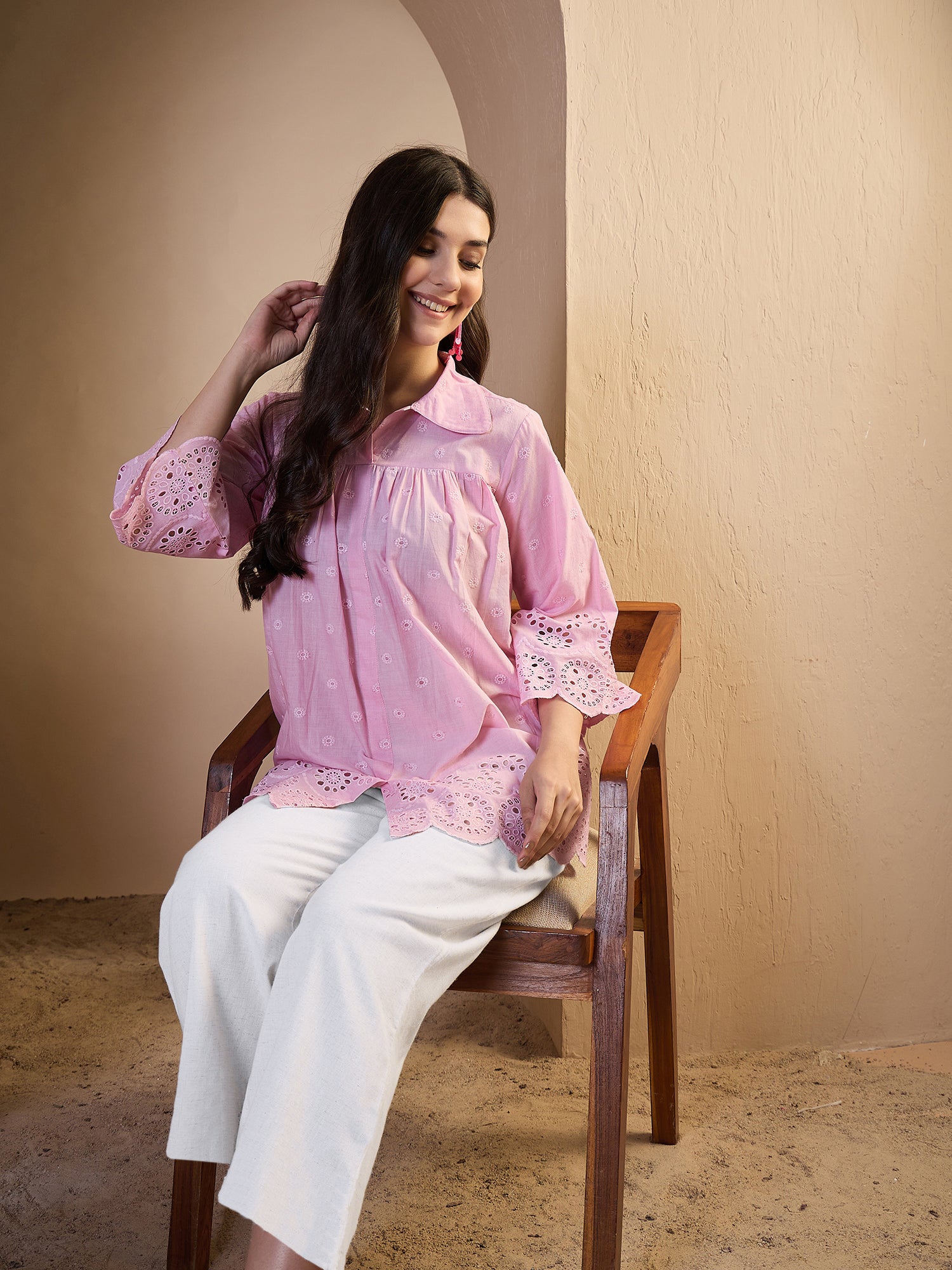 Pink and pink embroidered tunic ,has a shirt collar, three-quarter sleeves, embroidered detail,
