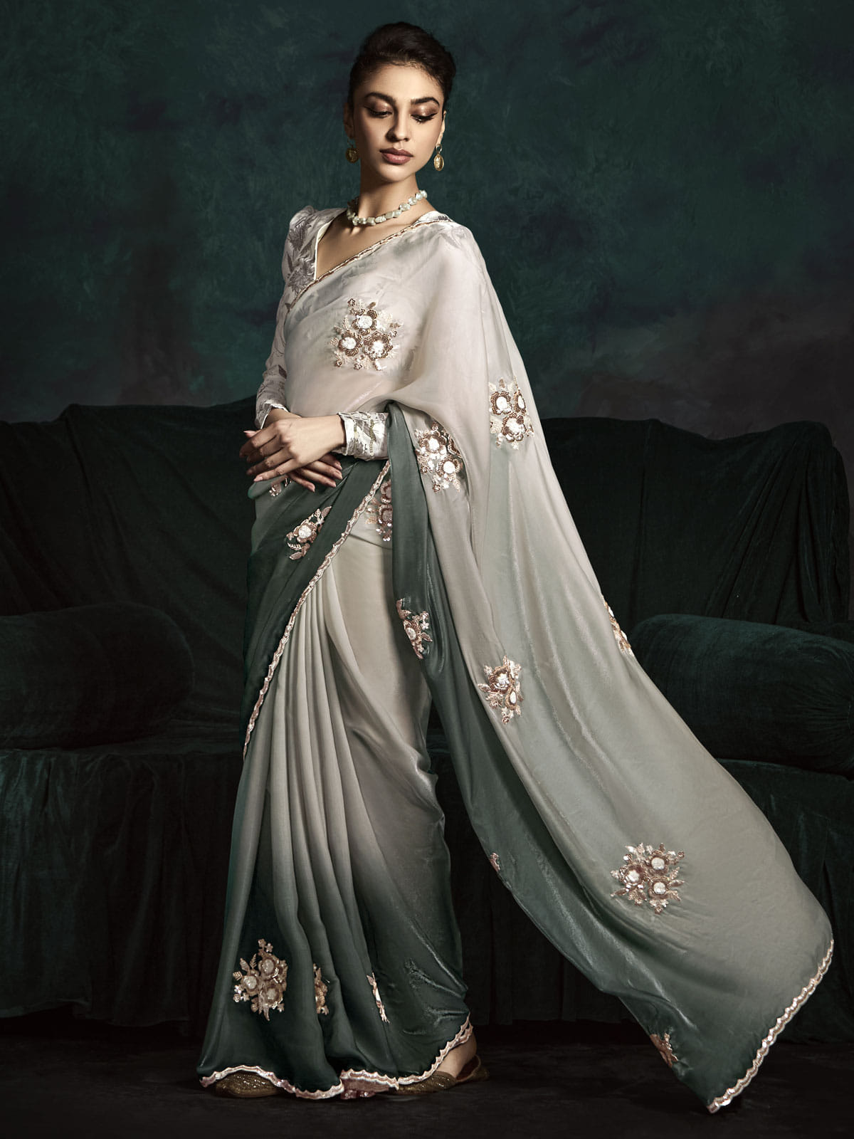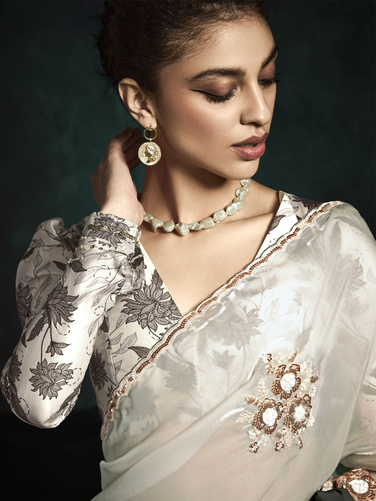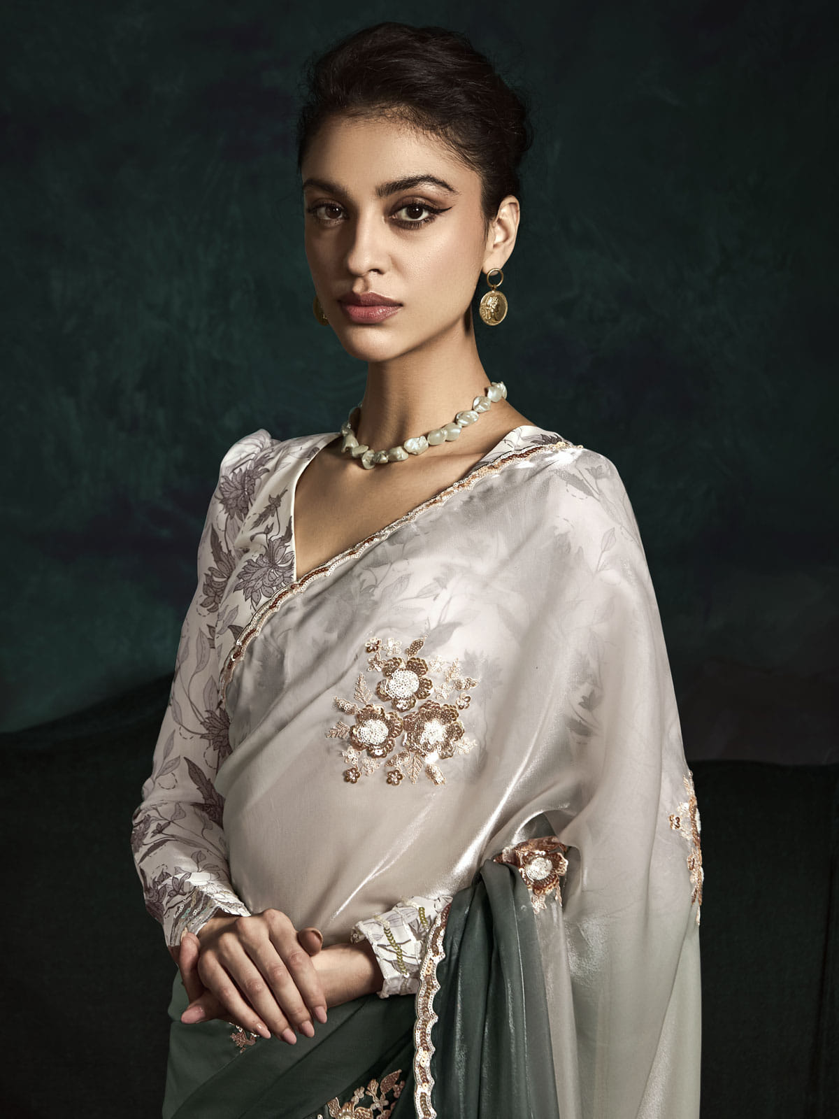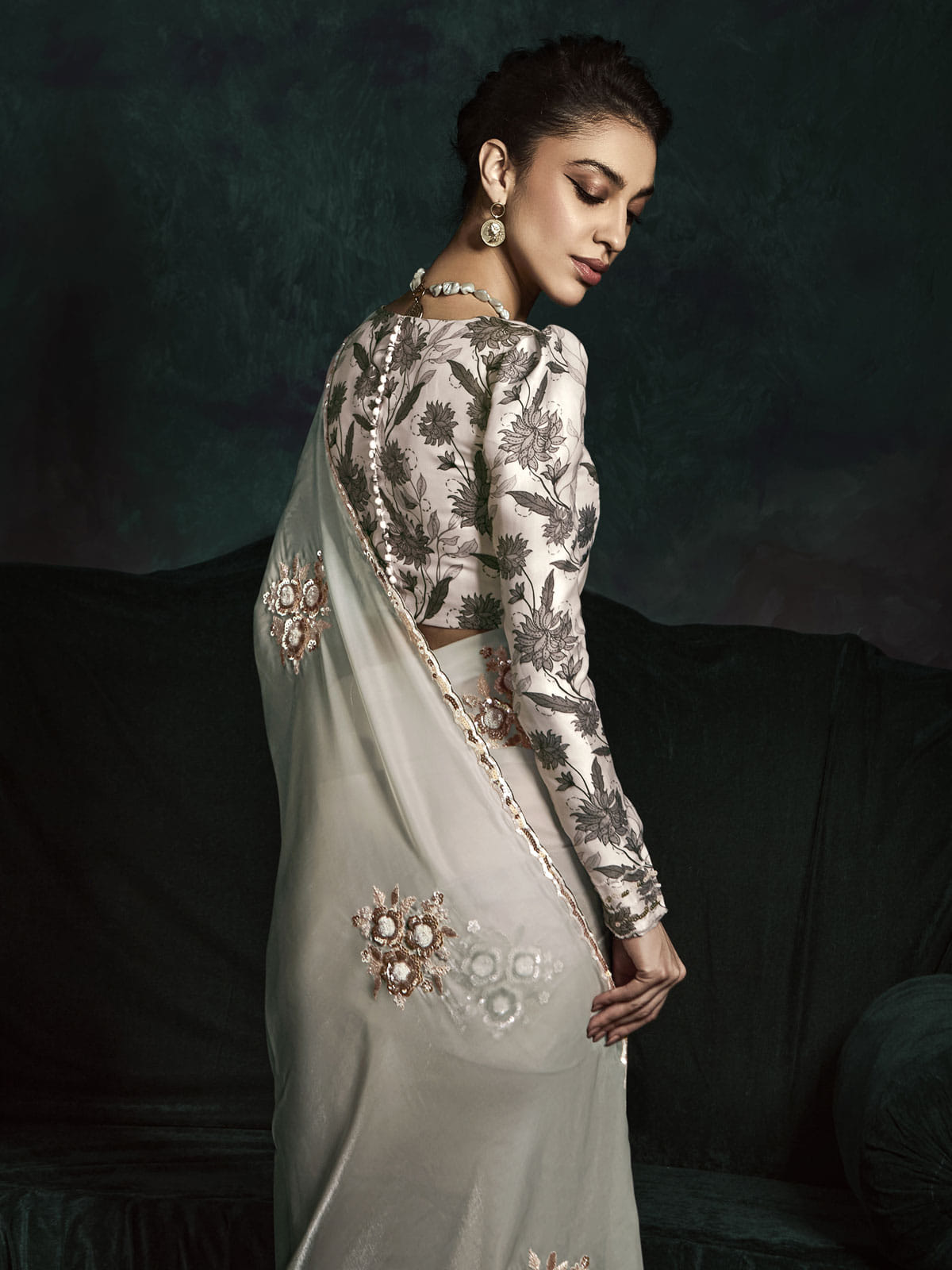 This Silver Grey And Charcoal Handwork Tissue Silk Saree is a perfect blend of traditional artistry and modern elegance. The luxurious fabric drapes beautifully, making it ideal for weddings and special occasions. The intricate zari foiling, fine zari and resham thread work, sequins, beads, and latkans on the border and pallu add a touch of sophistication. The eye-catching multicolored digital print blouse with zari accents completes the sophisticated and elegant look.