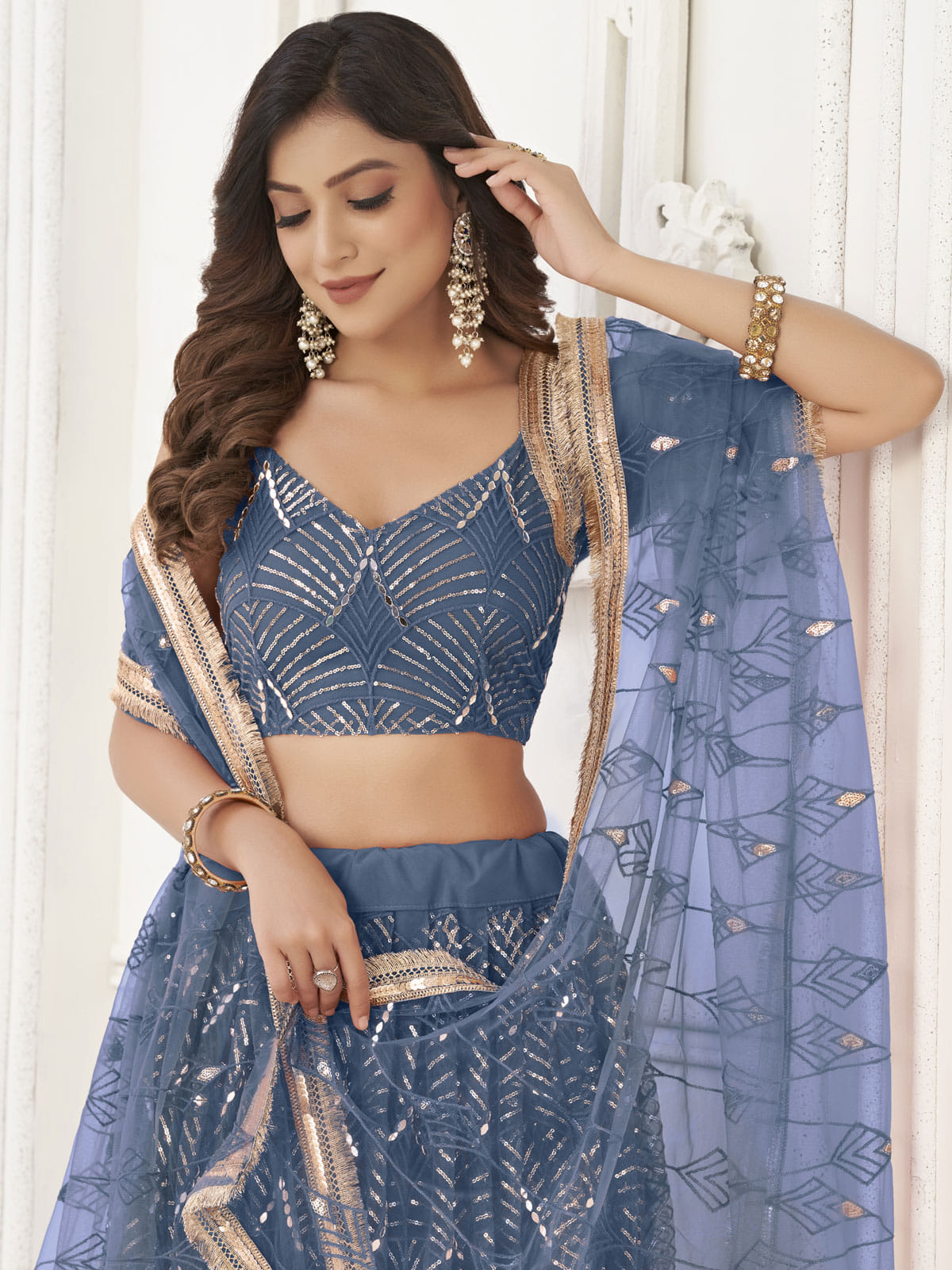 Elevate your festive or wedding look with our Sky Blue Trendy Embroidered Lehenga. Featuring intricate embroidery work, this lehenga is the perfect blend of style and tradition. Its elegant design and trendy color will surely make you stand out at any occasion. Don't miss out on this aesthetically crafted piece!