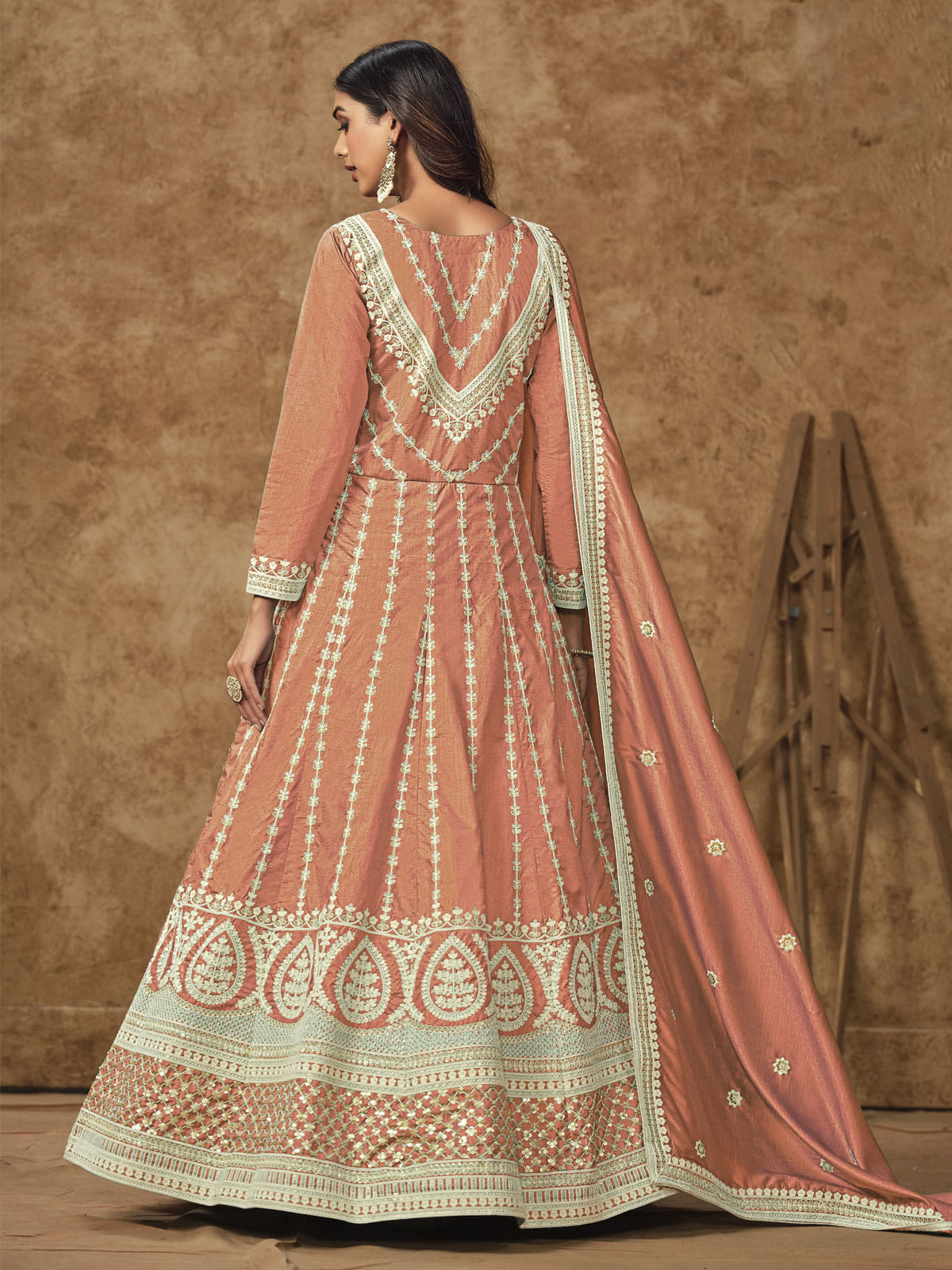 Elevate your style with our Soft Peach Silk Anarkali Suit. This traditional outfit features intricate embroidery and thread work, giving it a touch of elegance. Paired with matching pants and a silk dupatta, it's perfect for any wedding or festive occasion. Be the center of attention with this beautiful and stunning ensemble.