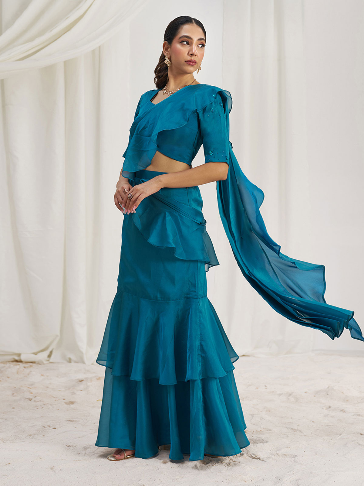 Indulge in elegance with our Spectacular Teal Blue Hand Work Organza Silk Ruffle Saree. Made with luxurious organza silk, this saree offers a stylish drape and features intricate handwork embroidery on its matching blouse. With a comfortable fit and a stunning design, this saree is perfect for events and parties. Available in sizes XS to XXL.