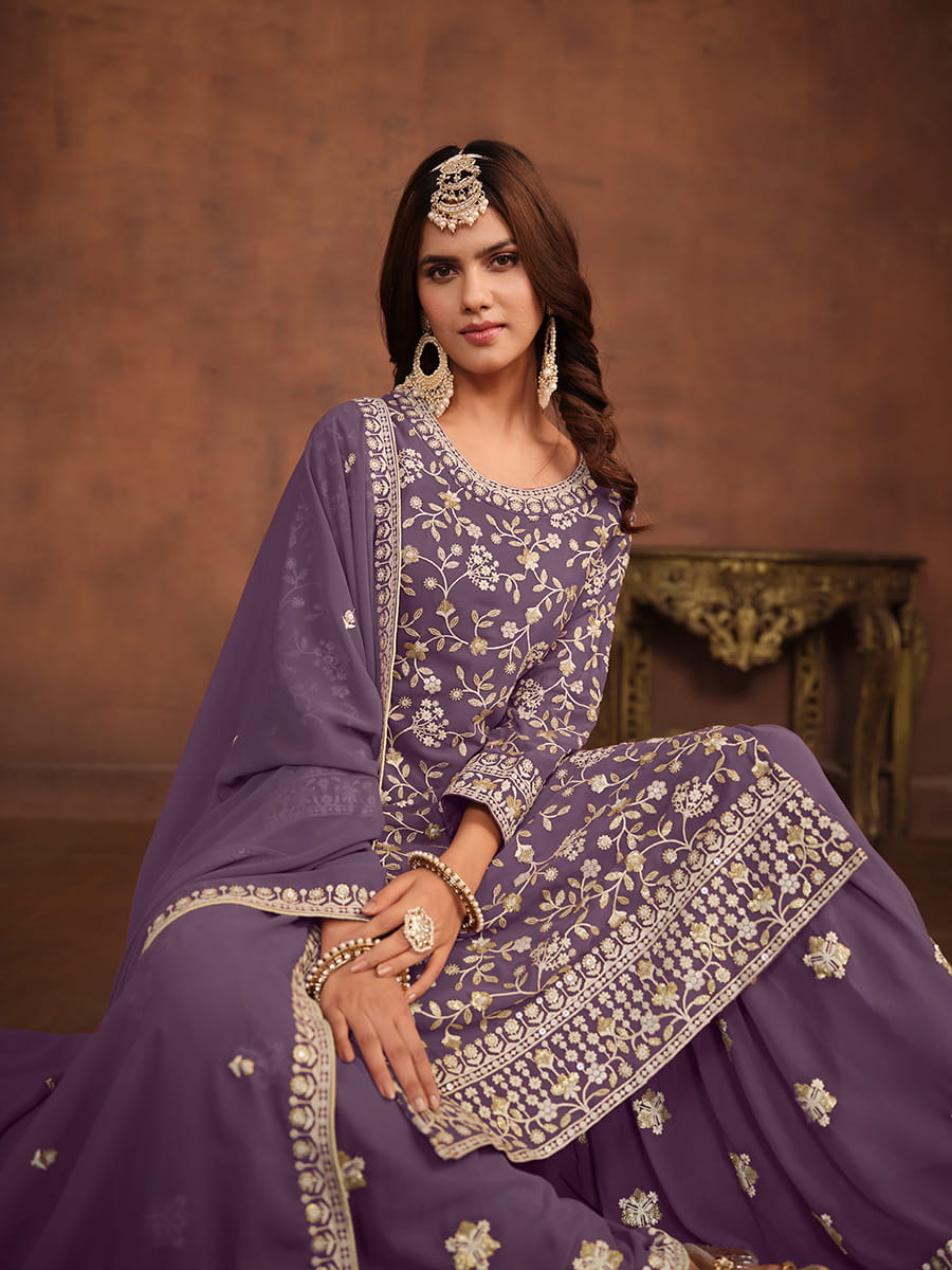 Buy splendid violet georgette partywear sharara-style-suit online at best shopping price. This cozy set comprises a georgette sharara suit with matching georgette dupatta and georgette bottom.