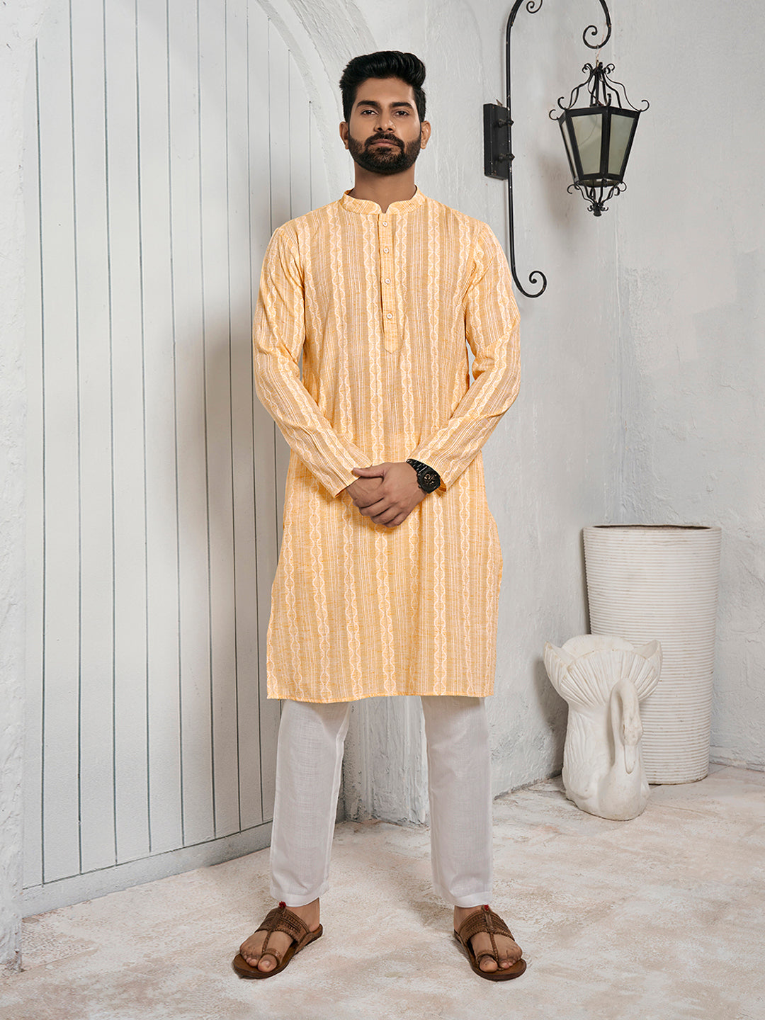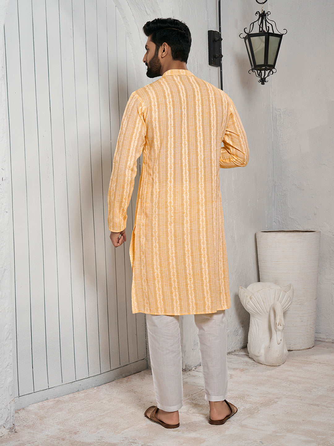 Expertly crafted with a mustard yellow striped design, this straight shape kurta features a stylish mandarin collar and long sleeves. The knee length and straight hem add a touch of sophistication to any outfit. Made with a machine woven regular cotton jacquard, this kurta is both comfortable and easy to care for. Perfect for any occasion, from casual to formal.
