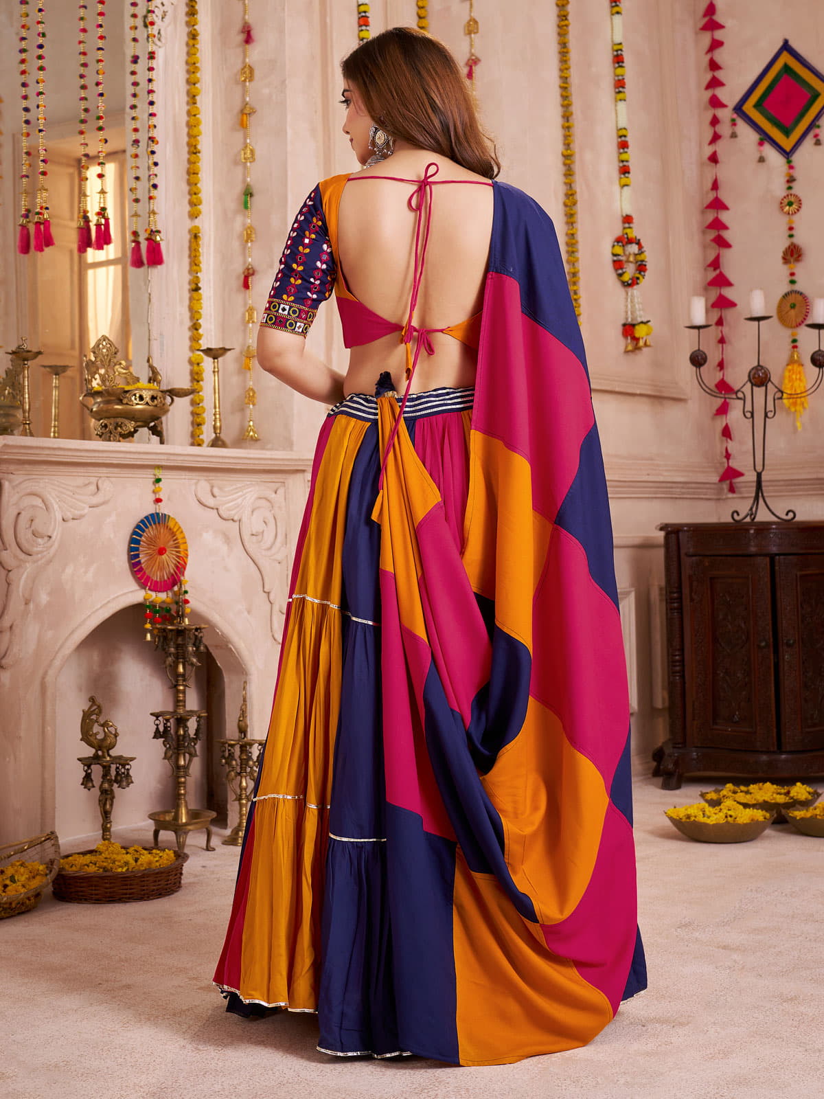 Celebrate Navratri in elegant style with this Multi Color Cotton Chaniya Choli, crafted from premium viscose cotton to ensure breathable comfort throughout festive celebrations. The lehenga features a unique frill and flair stitching pattern, creating a dramatic 10-meter wide flare that enhances every movement during Garba nights. This traditional yet stylish ethnic wear combines vibrant colors with intricate design, making it an ideal choice to elevate your festive wardrobe with both grace and comfort.