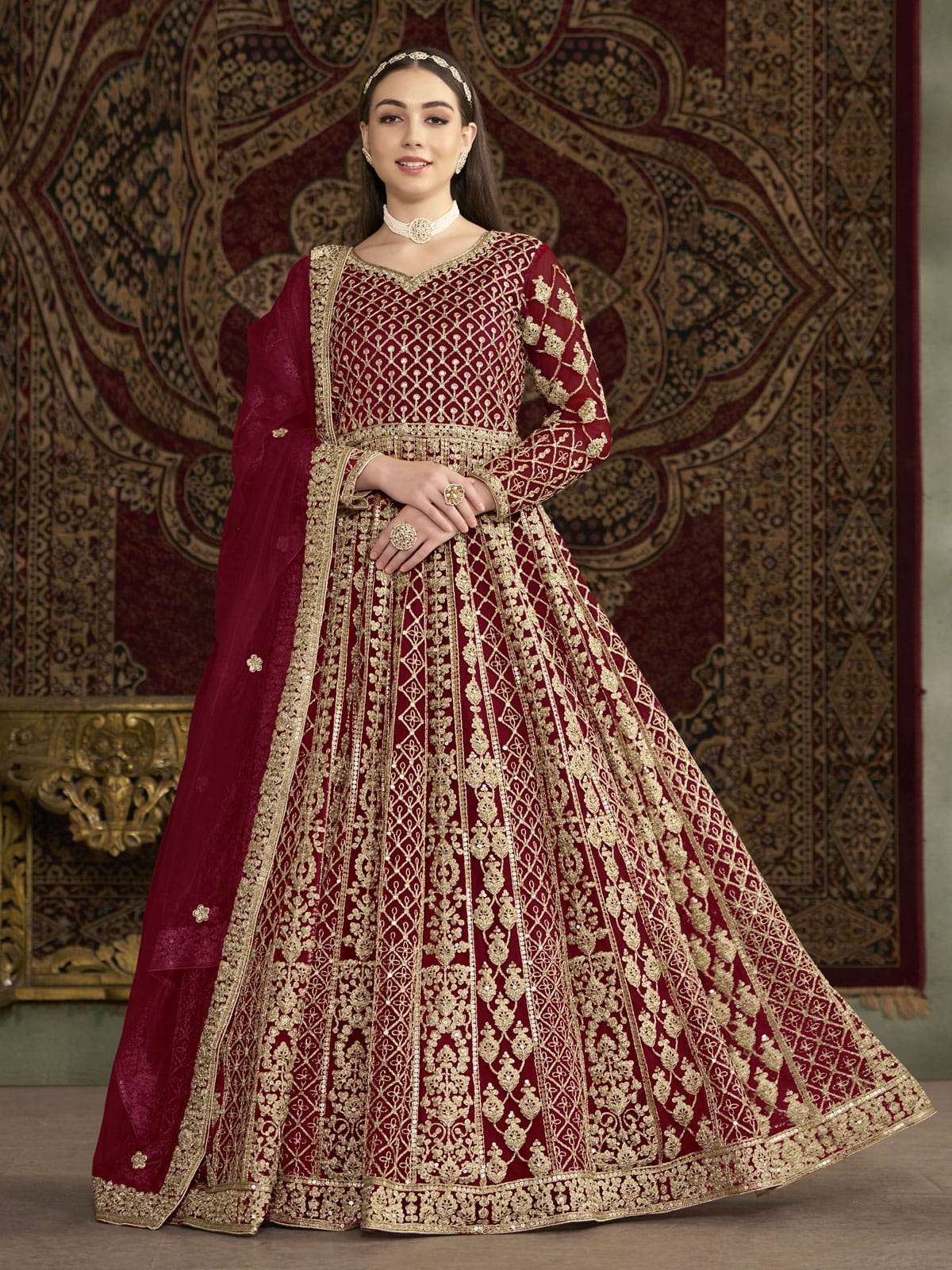 Experience true elegance in our Maroon All Over Embroidered Net Wedding Anarkali Gown by Empress. Made from premium net material, this gown boasts intricate zari and sequins work, elevating your wedding or festival look. Finish off the ensemble with a matching bottom and embroidered dupatta, and accessorize with traditional jewelry for a stunning and regal appearance.