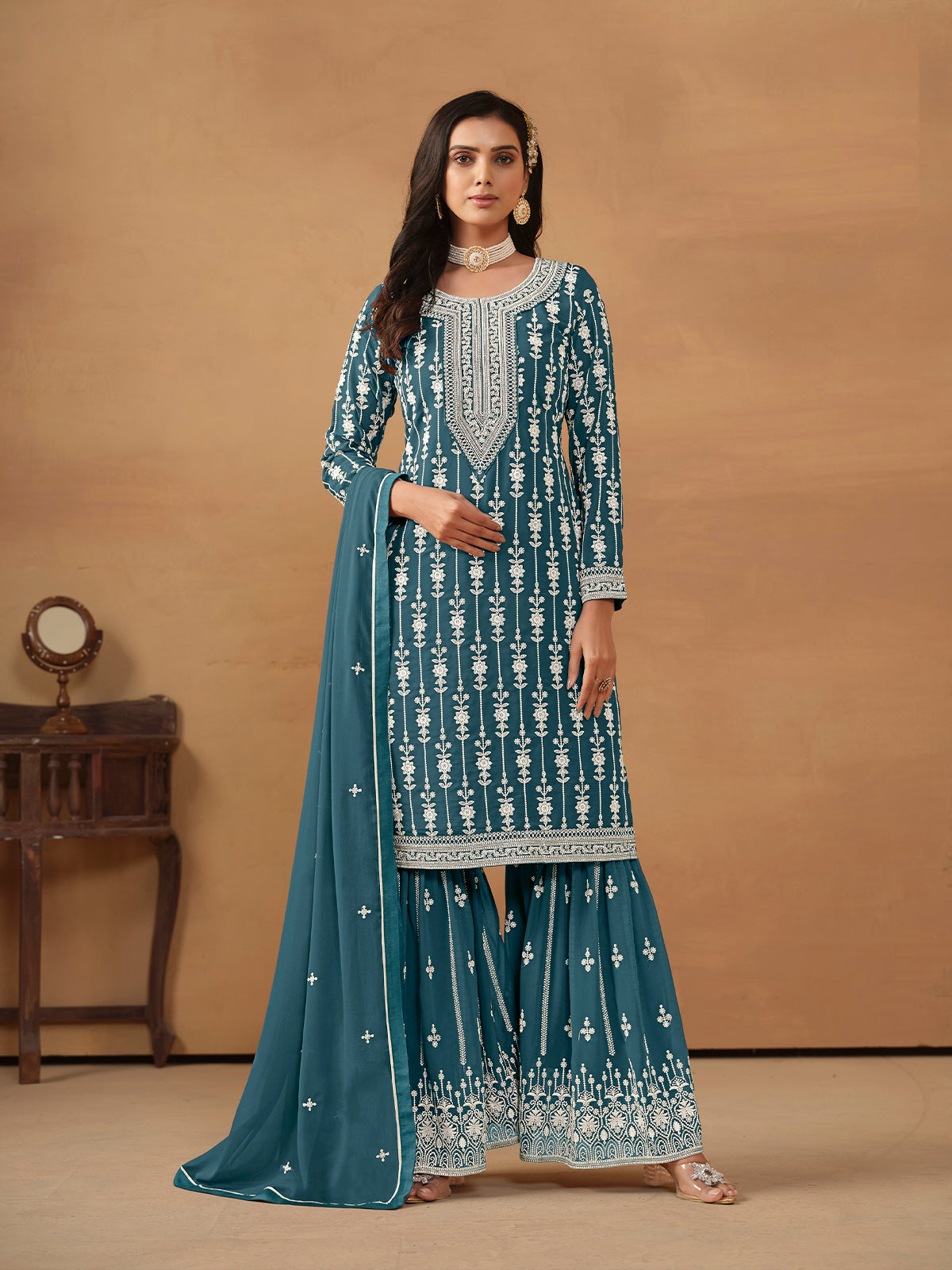 Elevate your festive wardrobe with our Turquoise Embroidery Designer Gharara Suit. This set features intricate resham thread and sequence work embroidery on a cut georgette top, paired with a gharara bottom and embellished with a satin lace and butti embroidery dupatta. Complete your look with heels and golden jewelry for a stunning desi girl look on Eid.