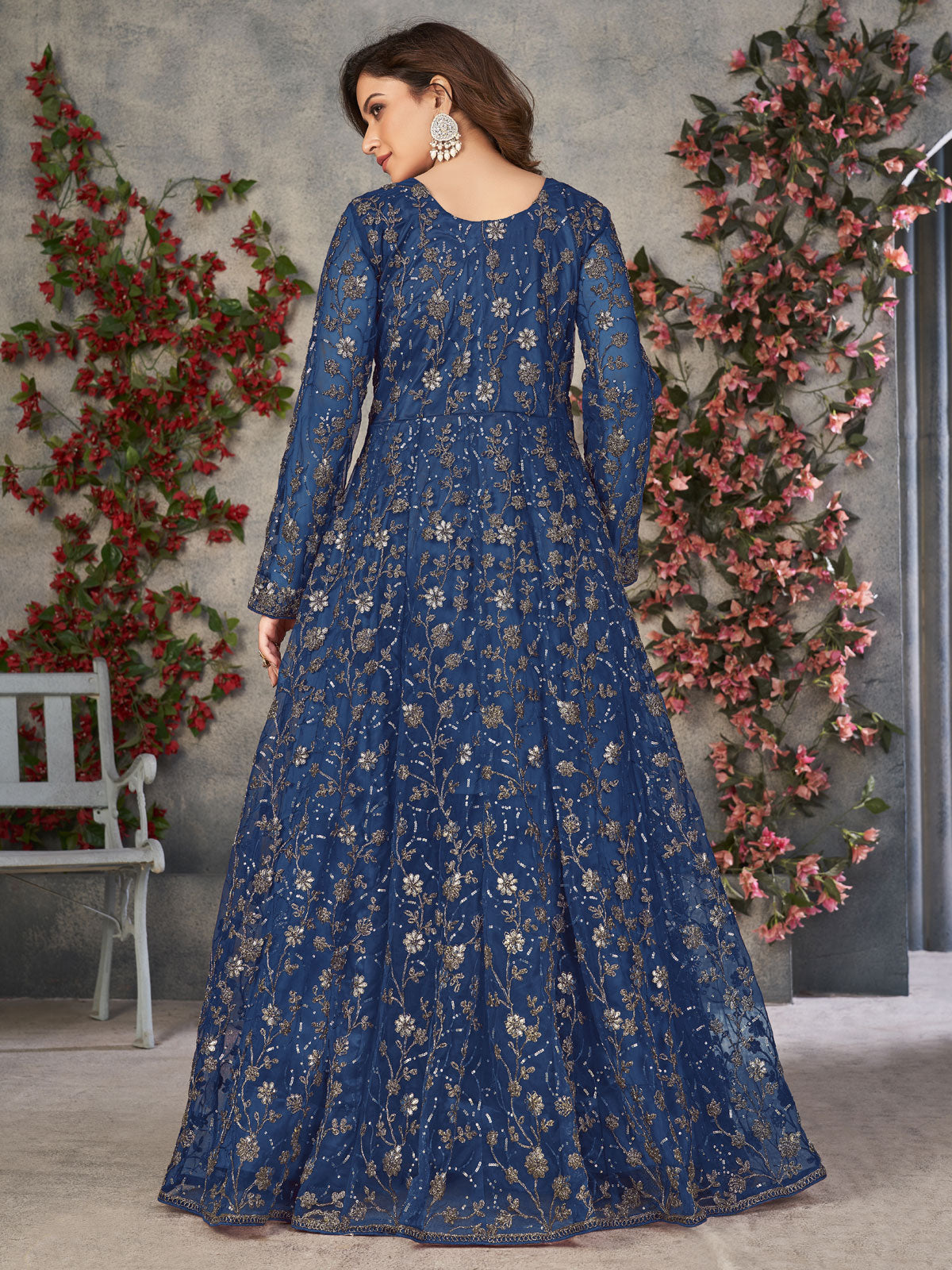 Celebrate in style with this exquisite teal blue Anarkali suit, expertly crafted for those who appreciate refined festive wear. The high-slit A-line silhouette merges timeless Indian design with modern elegance, while the premium net fabric serves as a canvas for intricate embroidery work. Delicate sequins and precise coding details add luminous dimension to the piece, creating a sophisticated interplay of texture and light. Each stitch reflects meticulous craftsmanship, ensuring you command attention at any special occasion with understated glamour and authentic artistry.