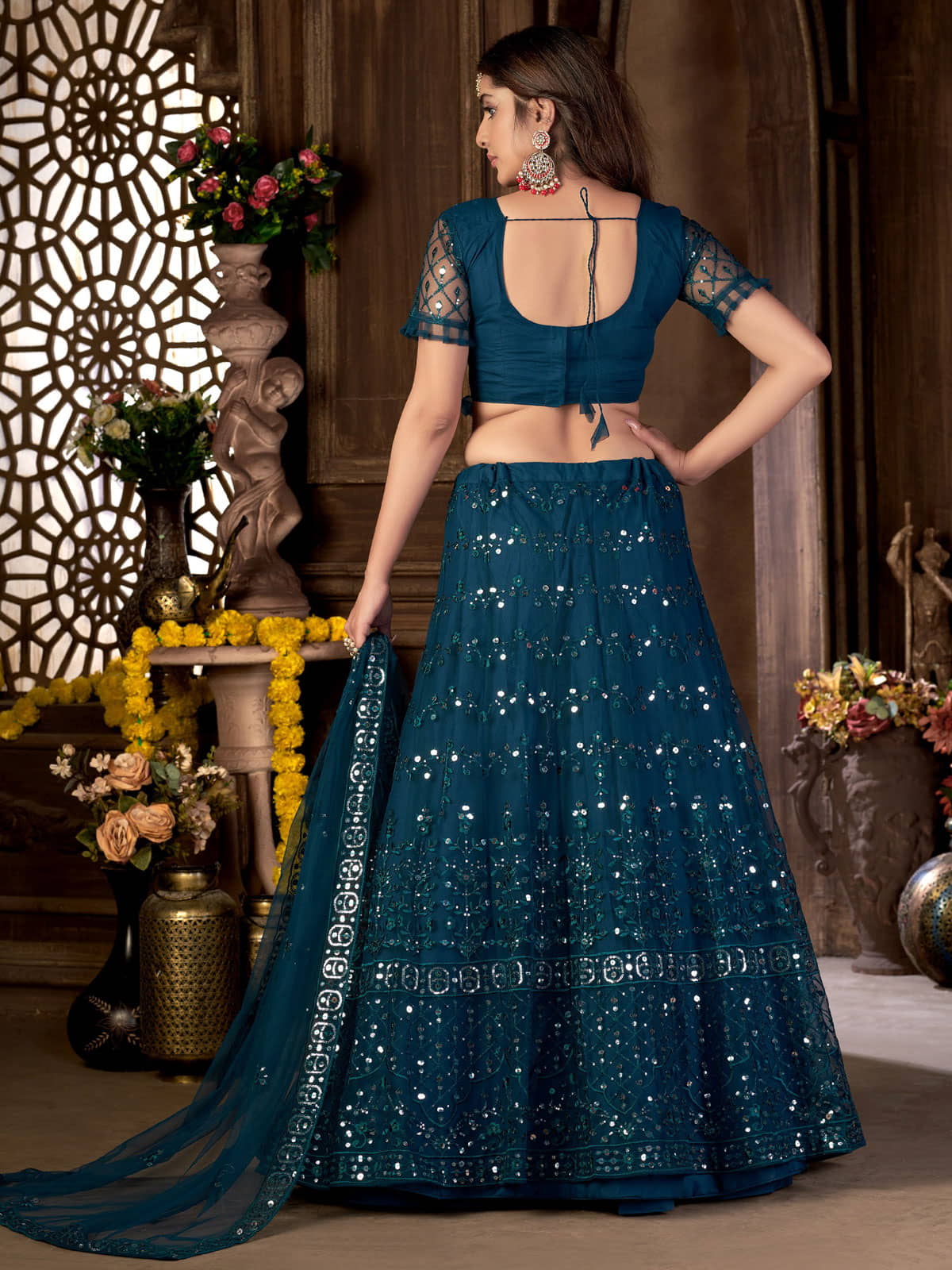 Get ready to sparkle in this Teal Blue Net Sequins Umbrella Lehenga Party Wear. The stunning sequins and thread embroidered work on the skirt, choli, and dupatta will make you stand out at any event. The lining is provided for your comfort and you can choose to have it custom stitched. Actual product may slightly vary from image.