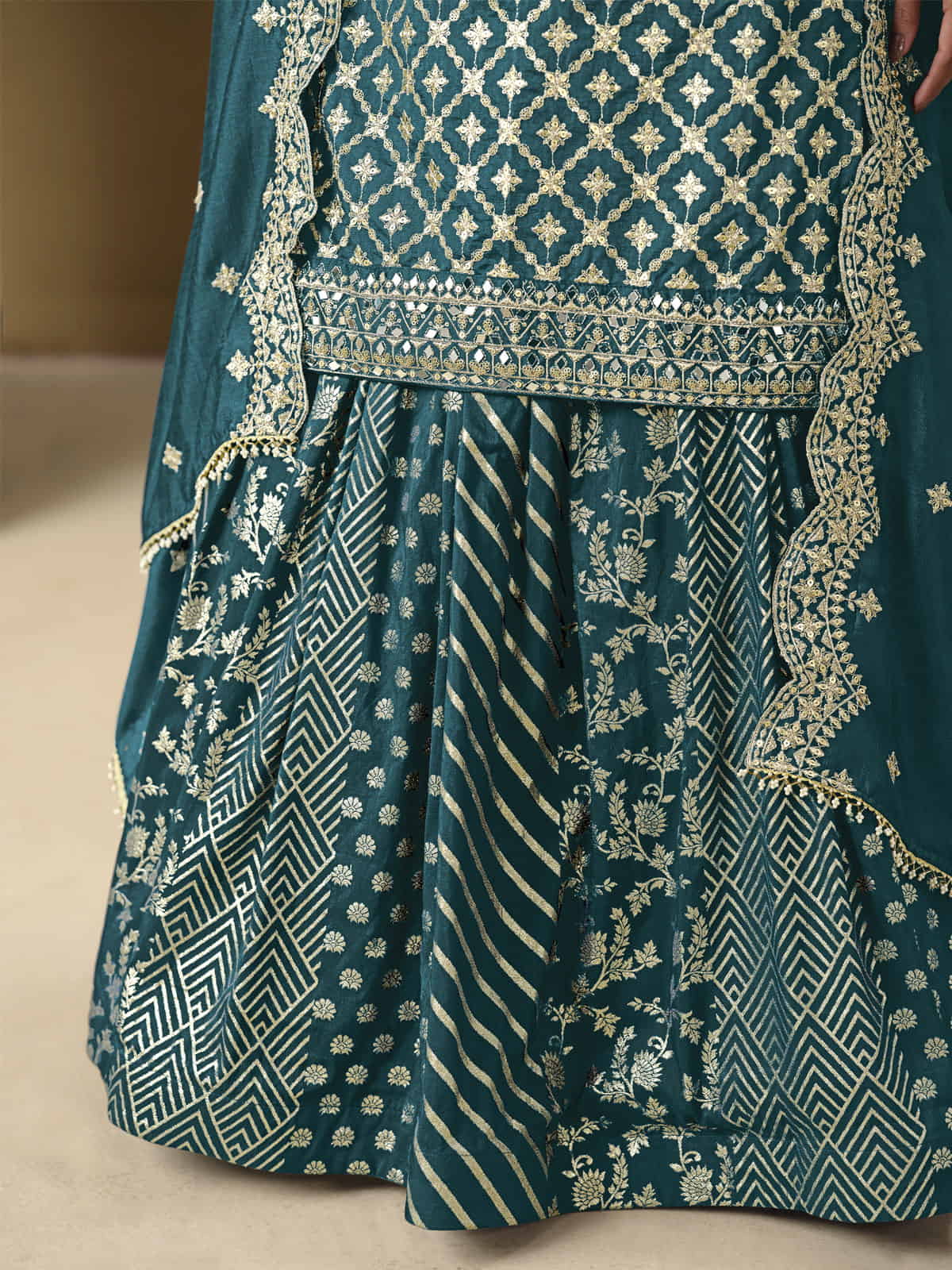 This Teal Embroidered Silk Lehenga Set from Inddus is crafted in art silk jacquard with a poly shantoon lining, offering both elegance and comfort. Detailed with intricate resham embroidery, sequins, and mirror work, it showcases exquisite floral and ornamental motifs. The round-neck kameez with quarter sleeves pairs beautifully with the scalloped dupatta, creating a refined ensemble perfect for formal occasions. Please note, slight color variations may occur due to lighting or screen settings.