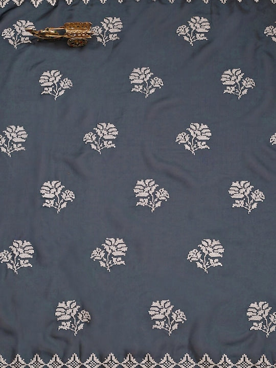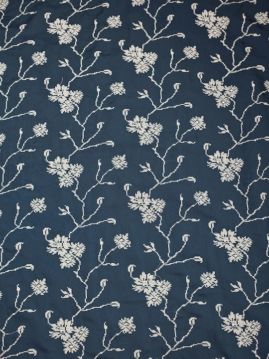 This teal floral embroidered dress material is perfect for creating a stunning, personalized outfit. The kurta fabric features delicate white embroidery and sequin details, while the solid bottom fabric allows for versatile styling. The matching dupatta with taping border adds an elegant touch. (47 words)