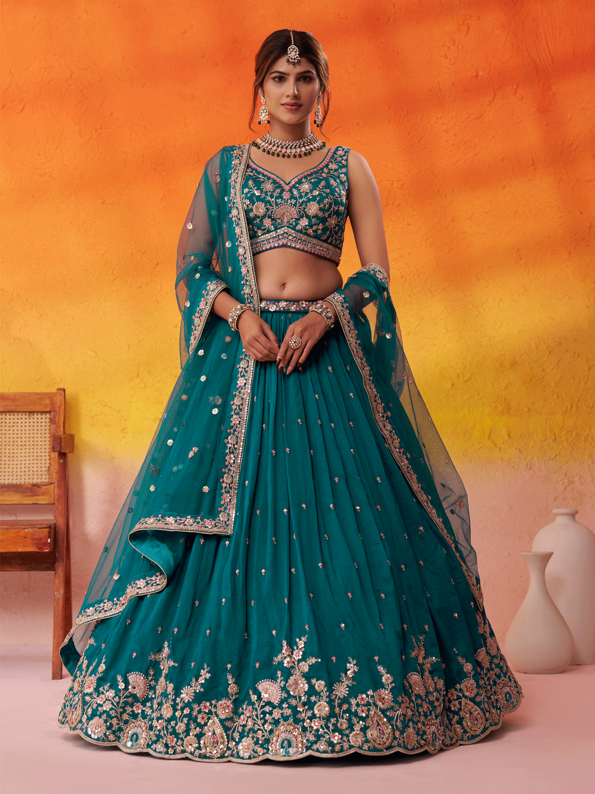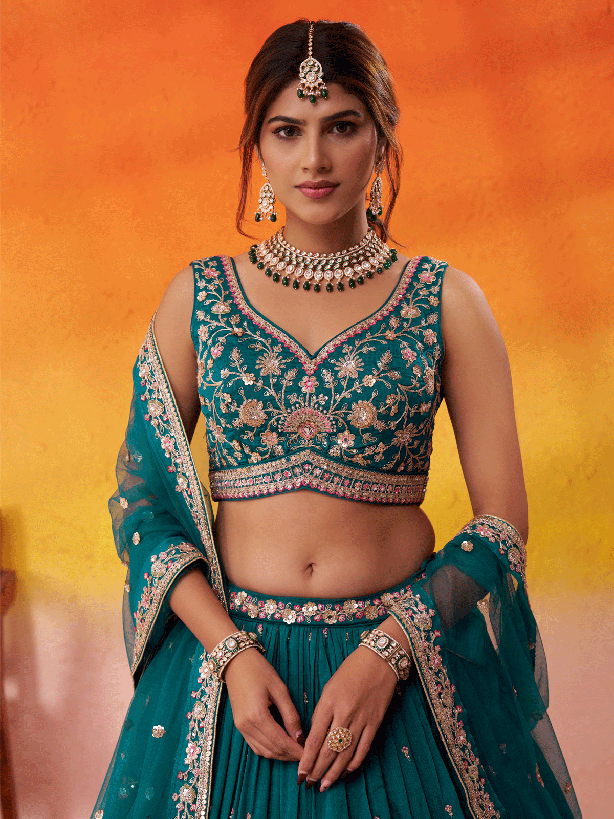 Embrace timeless bridal elegance with this Teal Premium Georgette Lehenga Choli, meticulously crafted by Inddus to transform your wedding moments into cherished memories. The ensemble showcases exquisite artisanal embellishment featuring moti, sequins, coding, and refined thread embroidery, complemented by an intricate thread border. The generous 3.5-meter flair creates a luxuriously flowing silhouette that commands attention with every movement, ensuring you radiate grace and sophistication throughout your celebrations.