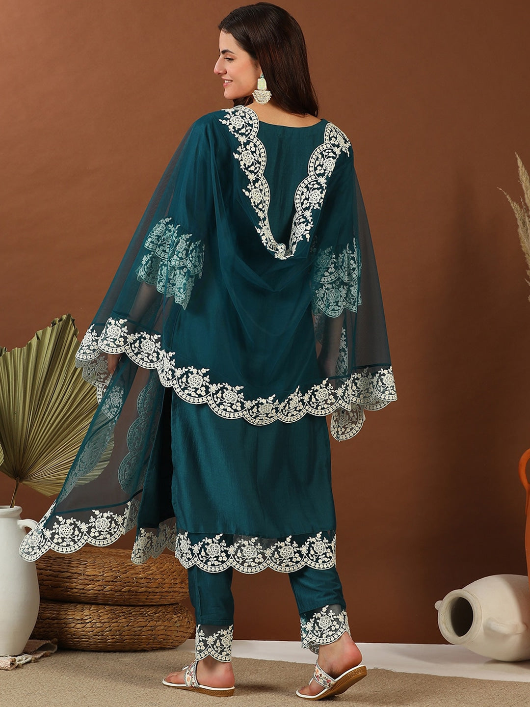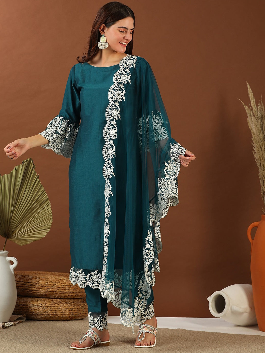 This teal Kurta with Trousers and Dupatta is the perfect addition to your wardrobe. The silk blend machine weave fabric provides comfort and durability. The round neck, three-quarter flared sleeves and thread work detail add a touch of elegance. The solid trousers, with its partially elasticated waistband and slip-on closure, complete the look. Add this to your collection for a stylish and versatile outfit.