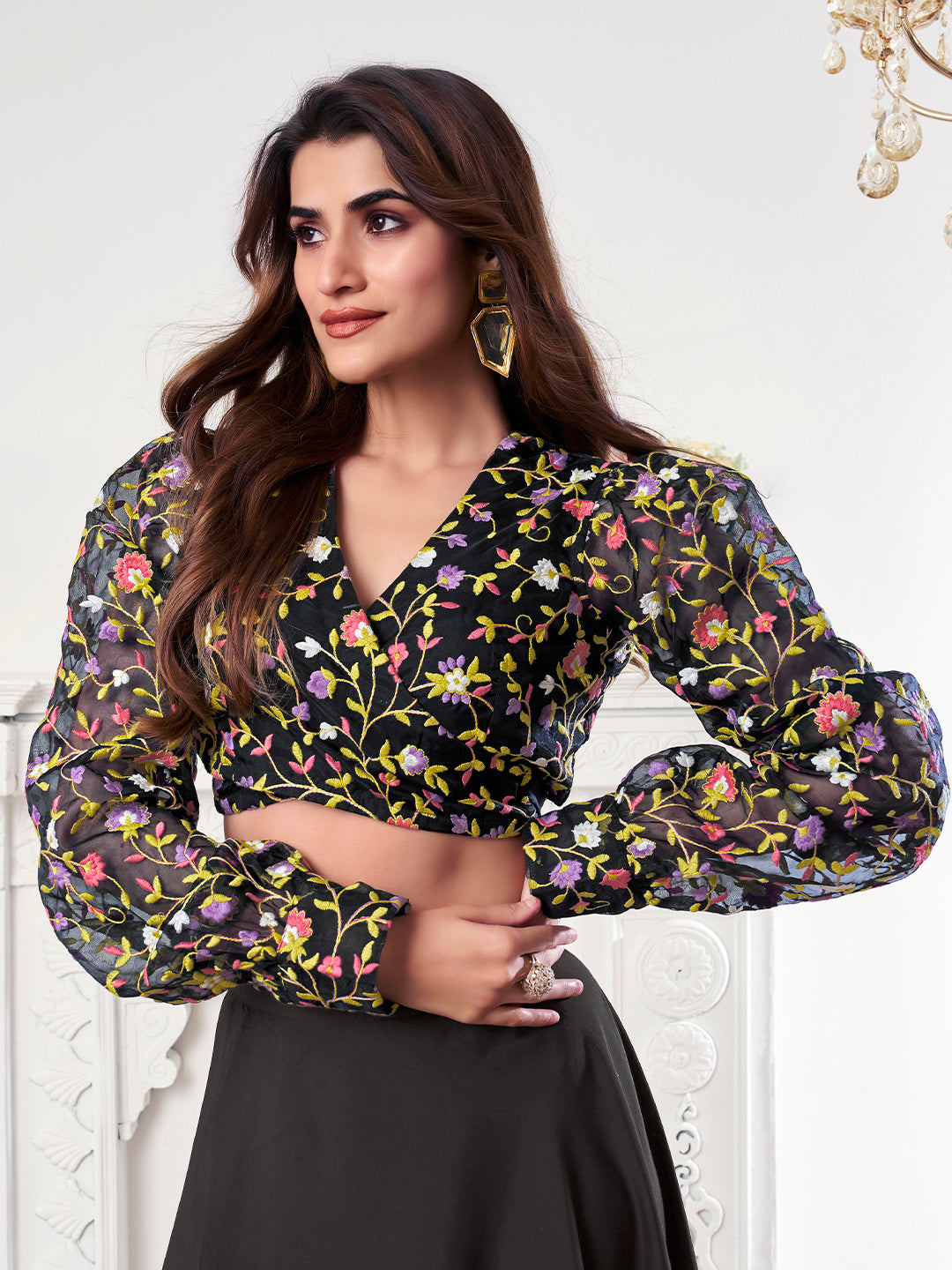 Complete your look with this elegant Thread Embroidered V-Neck Top With Skirt Co-Ords. The black embroidered top features a flattering V-neck and full sleeves, while the mid-rise skirt has a stylish flared hem and convenient zip closure. Made with a combination of lightweight polyester and luxurious silk blend fabric, these co-ords are perfect for any occasion. Dry clean for long-lasting wear.